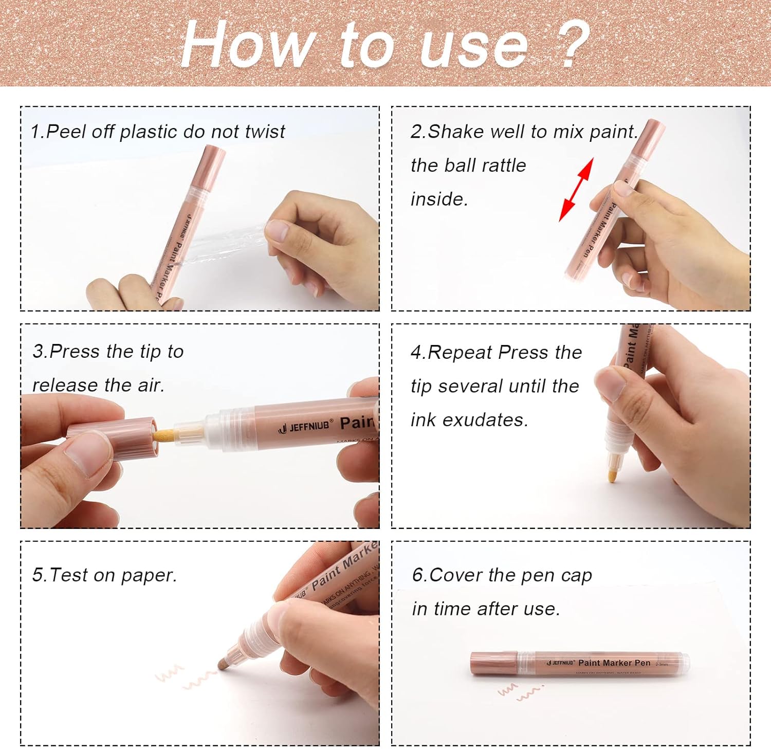 - 【Easy to Use】Tear off the plastic film. Shake well to mix paint. Keep press the tip until the ink exudates. You will see the change in the color of the nib from the ink flow.