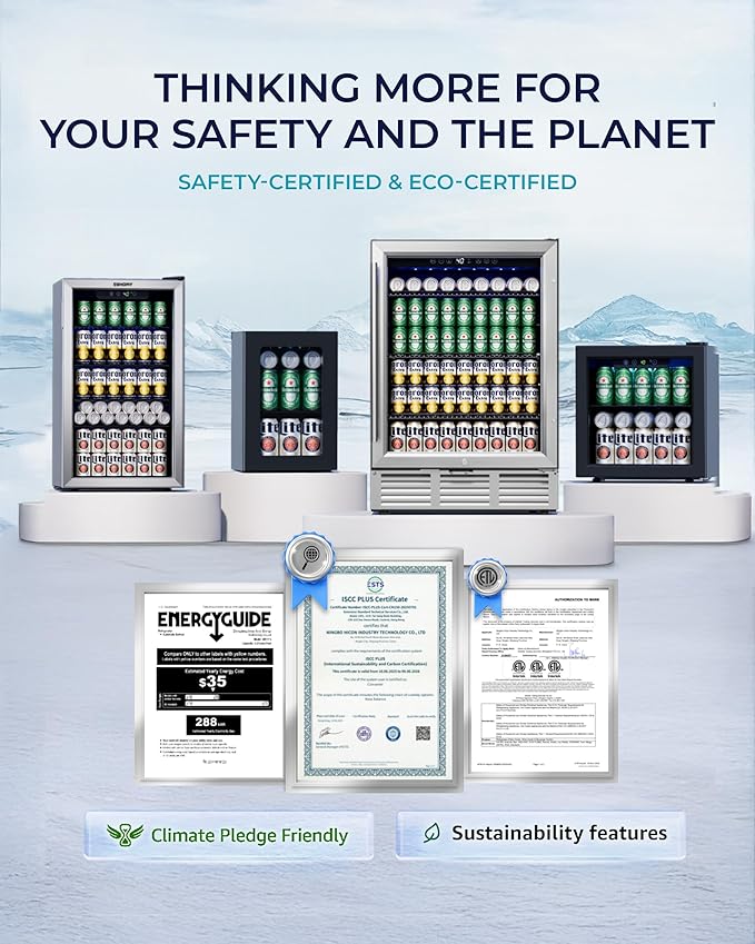 - HIGH-END DESIGN & LED LIGHT - The sleek glass door showcases the beverage without leaving the door open. Three-layer glass door provides superior thermal insulation to reduce the impact of ambient temperature. The three pane glass door can help to maintain an ideal humidity level to ensure the taste of drinks. Drinks Refrigerators gives you the classy lighting experience - The soft, white LED interior lighting beautifully showcases your beverages, even at nighttime