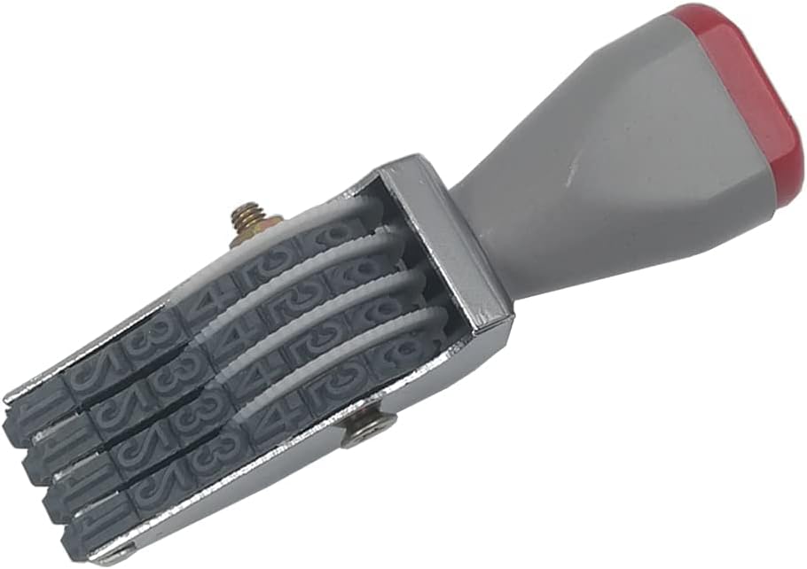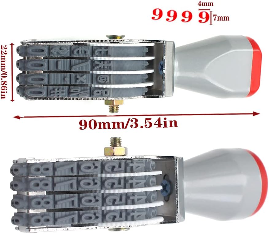 - 4 Digit Rotating Number Stamp Traditional 4 digit rubber stamps, Material : Metal, Rubber, Plastic; Size:Length :90 mm/3.54 in, Width:20 mm/0.78 in,High:25 mm/0.98 in, Character : Width:4 mm /0.15 in,Height:7 mm/0.27 in, Color : Gray black; Weight: 45 g, Package Content : 1 X Numbering Stamp (Without ink,Requires a separate ink pad)