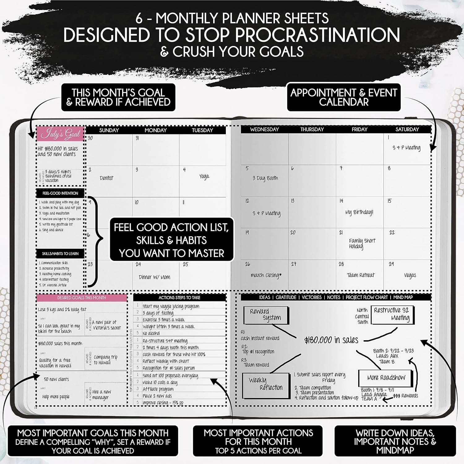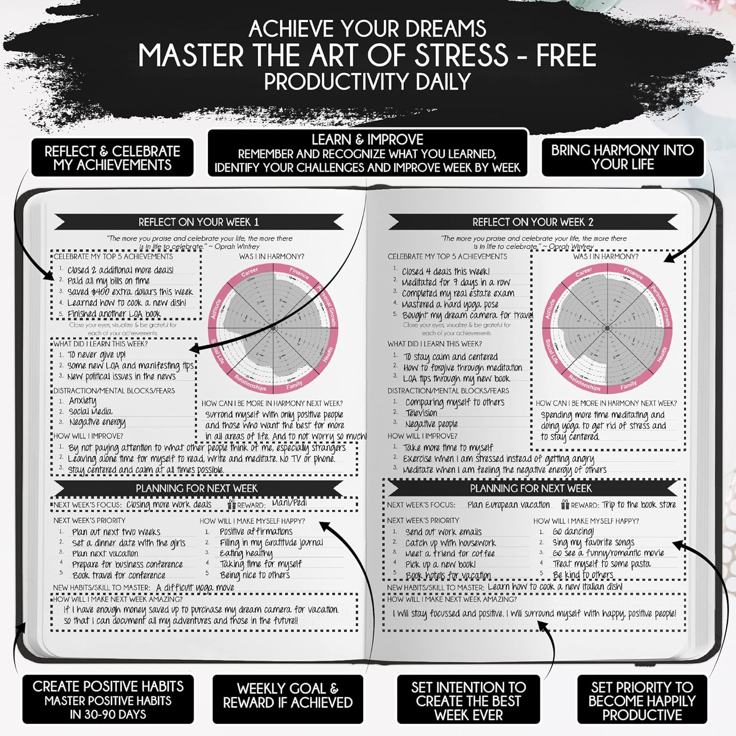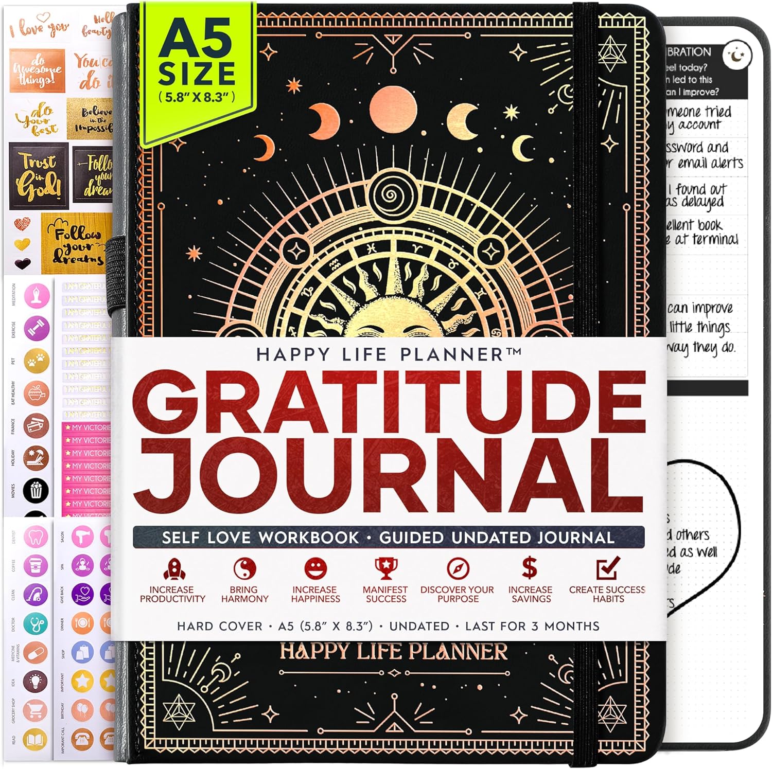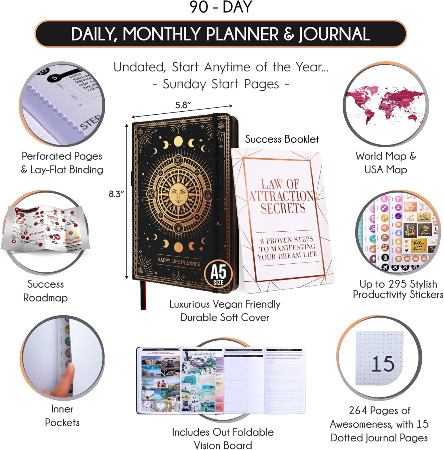 - GRATITUDE JOURNAL - This deluxe daily planner and gratitude journal for women comes in A5 size (5.8 x 8.3 inches). The life planner comprises 264 pages of thick 100 gsm paper, including 90 daily planning sheets, guiding you on how to become the best possible version of yourself on a mental, physical, and interpersonal level. It's a unique diary based on leading scientific studies proven to increase productivity and happiness. The journal features an out-foldable vision board to help you stay focused, morning and evening power questions, mind maps, reflection pages, habit trackers, a back pocket, and much more than any other planner on the market!