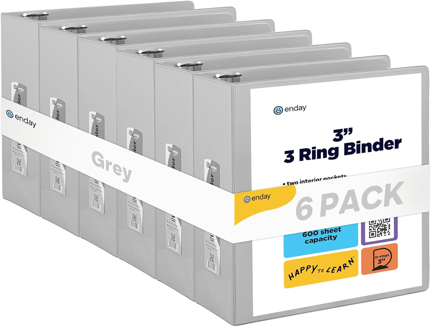 3 Slant D-Ring Binder 3 Inch Grey, 3 in Clear View Cover with 2 Inside Pockets Binder, Heavy Duty Colored School Supplies Binders,Also Available in Green, Red, Purple, Blue, Pink (6 PC) – by Enday