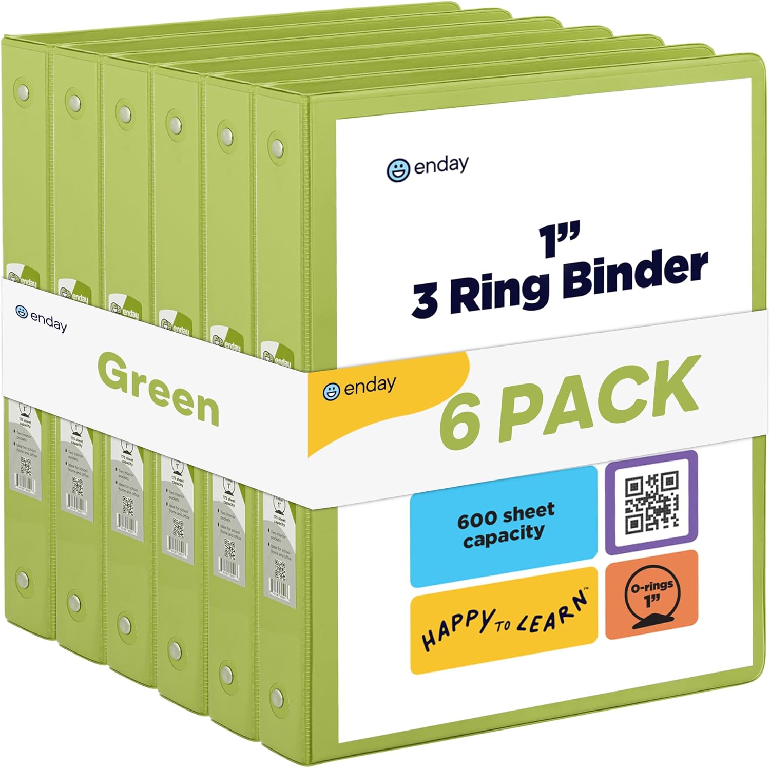 3 Ring Binder Green, 1 Inch, 1” Clear View Cover with 2 Inside Pockets Round Ring Binder, Colored School Supplies Binders, Also Available in Pink, Blue, Purple, Grey, and Red (6 PC) – by Enday