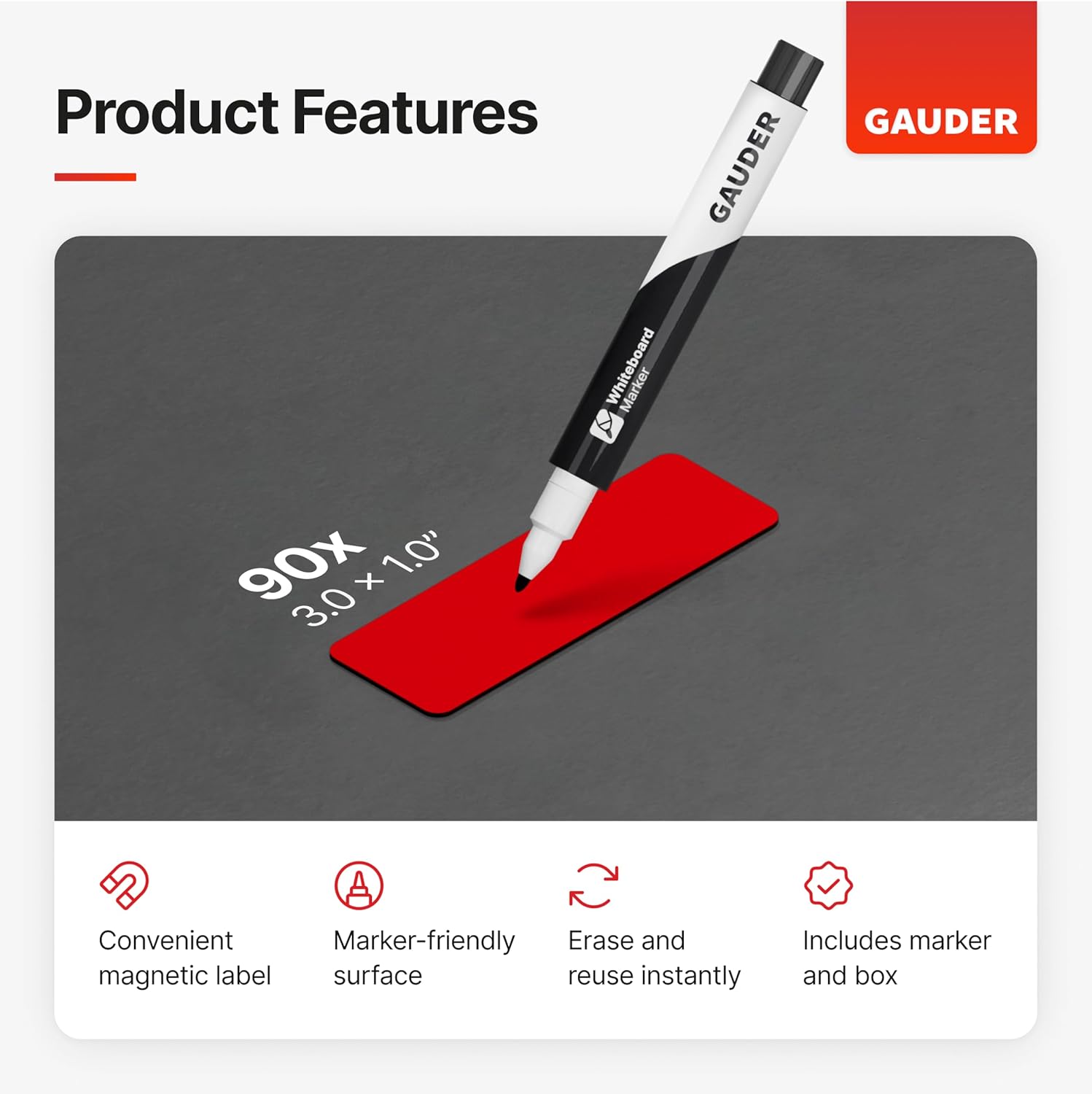 - REUSABLE AND SUSTAINABLE: GAUDER magnetic labels can be written on with the included whiteboard marker and reused repeatedly.