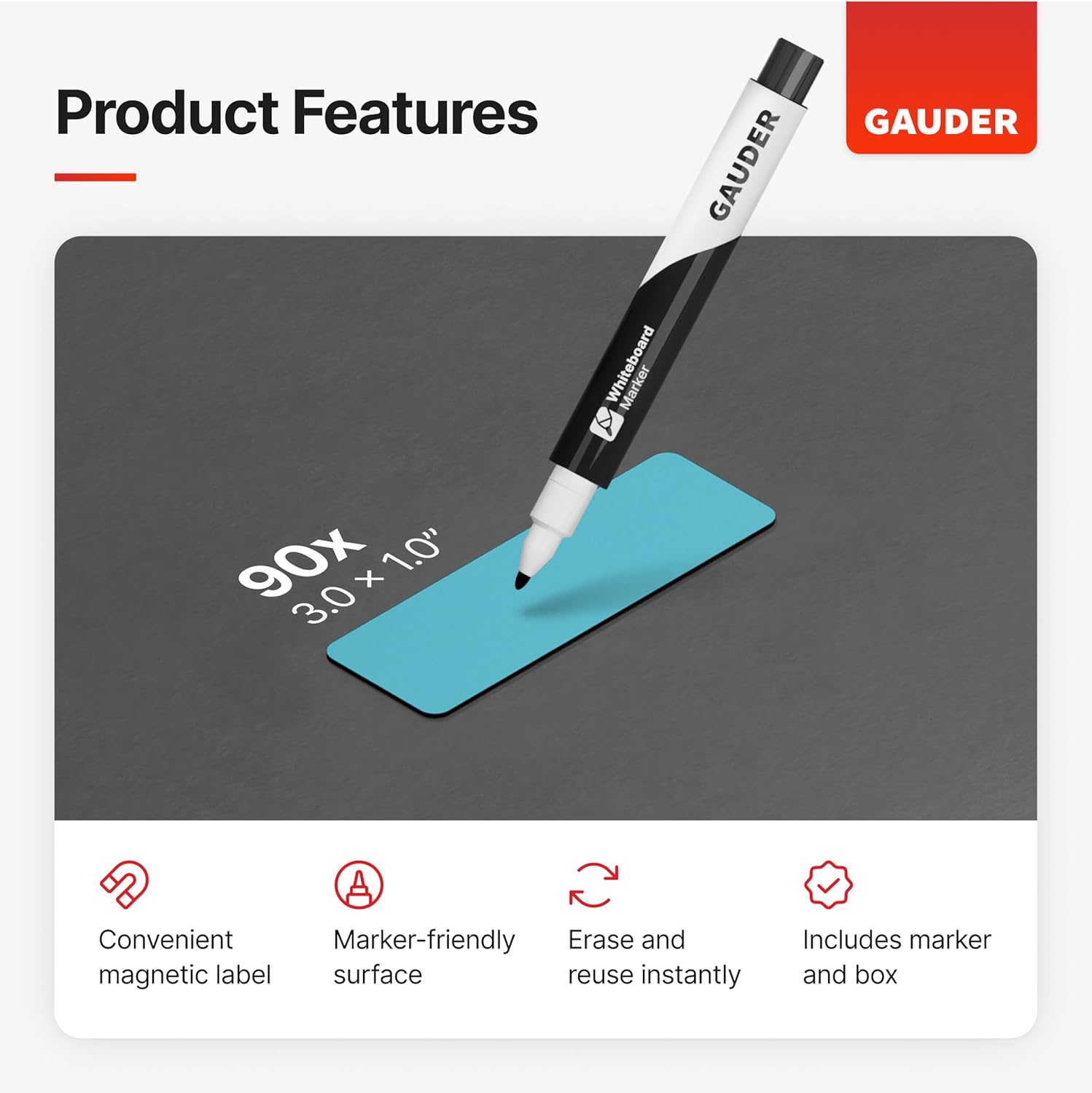 - REUSABLE AND SUSTAINABLE: GAUDER magnetic labels can be written on with the included whiteboard marker and reused repeatedly.