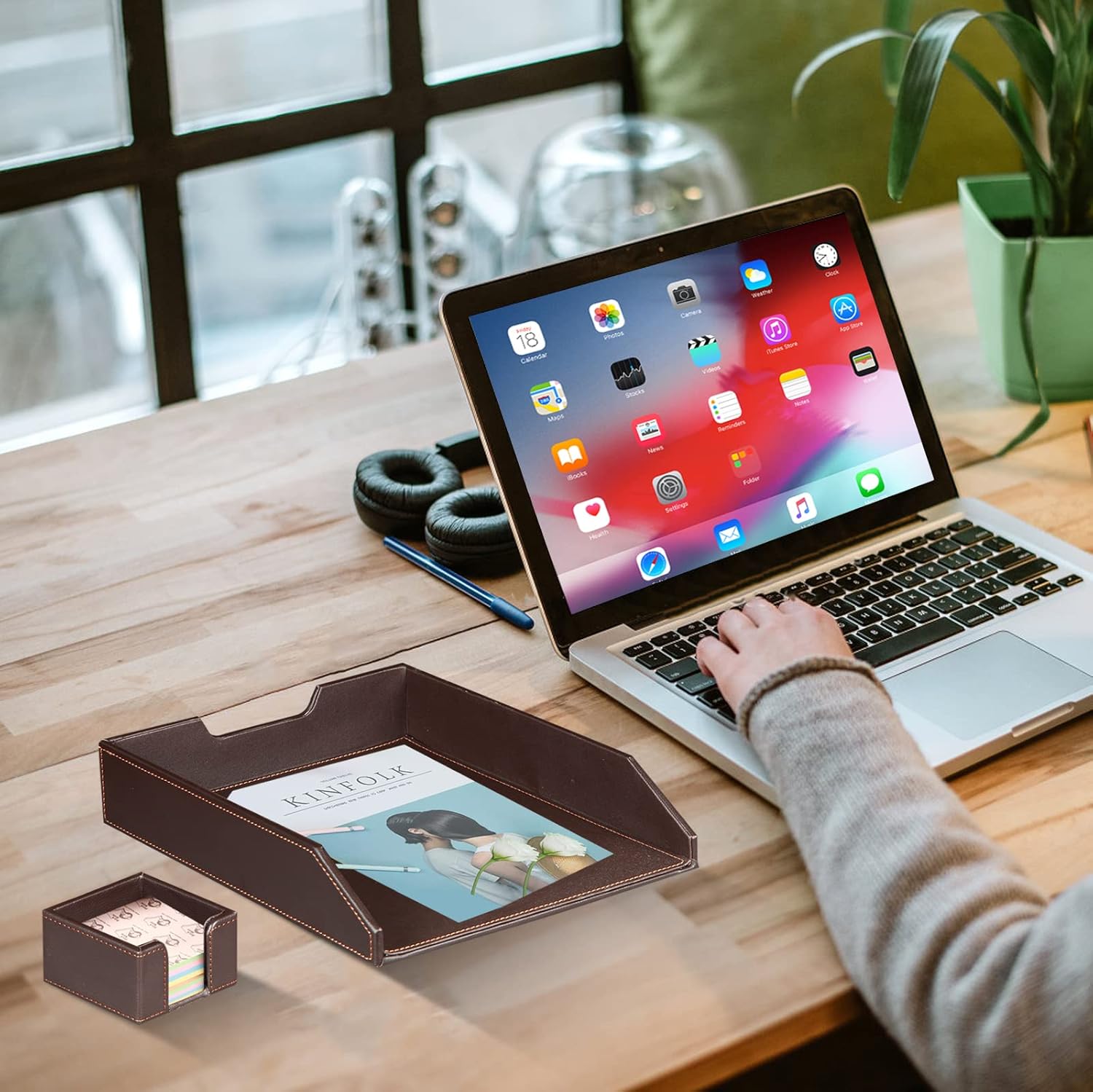 Ayunga PU Leather 6-piece Office Supplies Combination Set,Pencil Cup,Business Card Holder,Sticky Note Dispenser,Mail Sorter,Letter Tray,Files Holder,Suitable for Self-use and Friend Gifts (Brown)