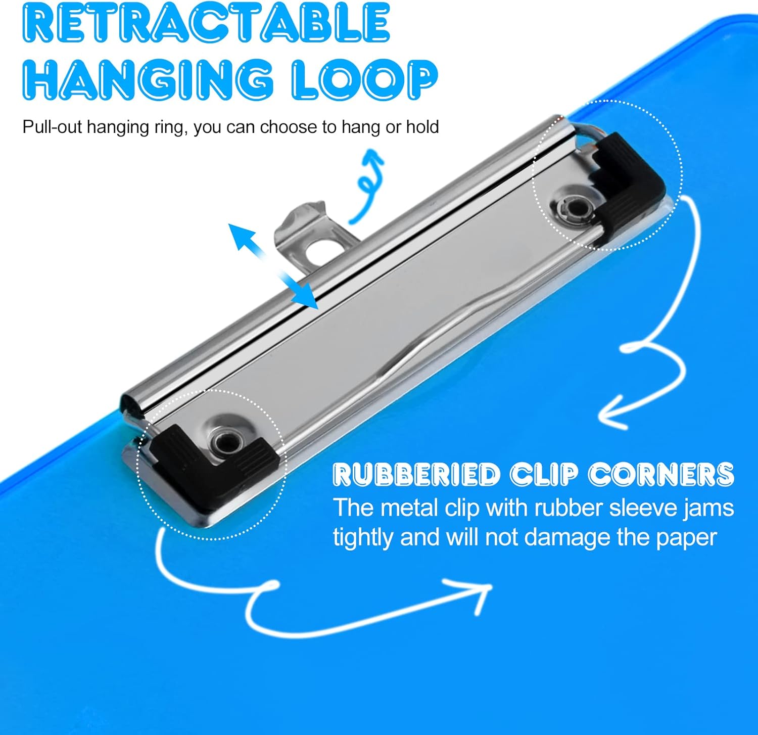 - RETRACTABLE HANGING LOOP: The clipboards have a built-in hanging hole, which can help you place your documents randomly. And it can be stowed away when not needed.