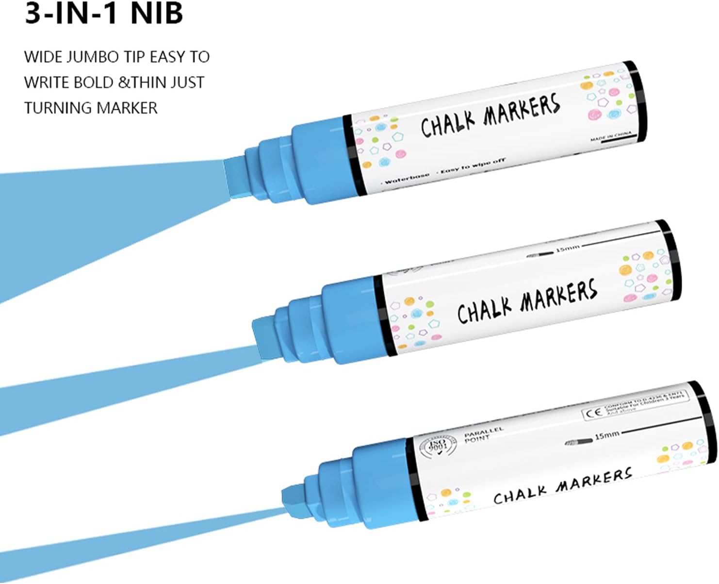 - 3-in-1 Nib Design - 15mm Jumbo Nib: These car markers washable for auto have a 3-in-1 nib that allows you to write wide, thick or thin lines. 15mm jumbo nib is ideal for large area coloring, bold strokes, and quick coverage. Simply rotate the marker to change the thickness of the line to meet a variety of drawing and writing needs