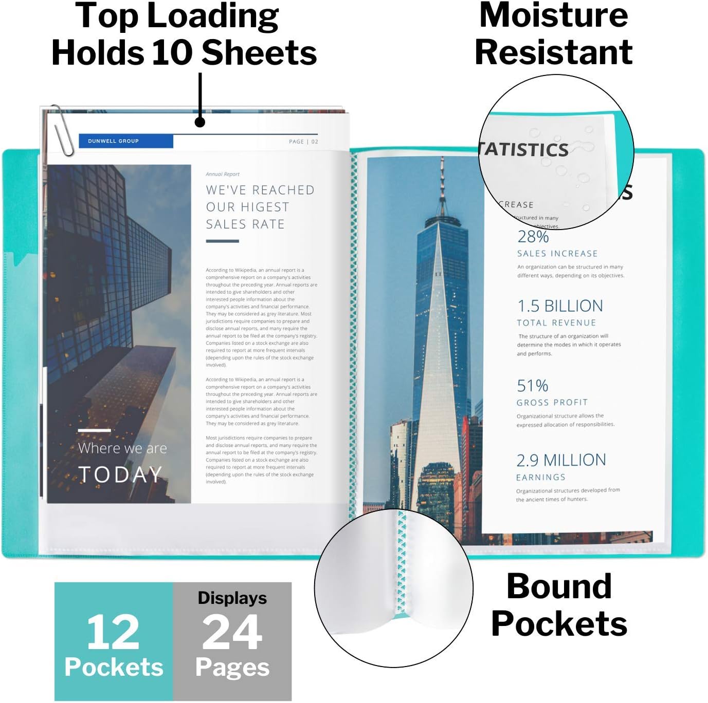 - PRESENTATION READY: 12 bound sleeves display 24 pages, Perfect for client meetings, business presentations, job interviews. Make a great impression while protecting your documents.