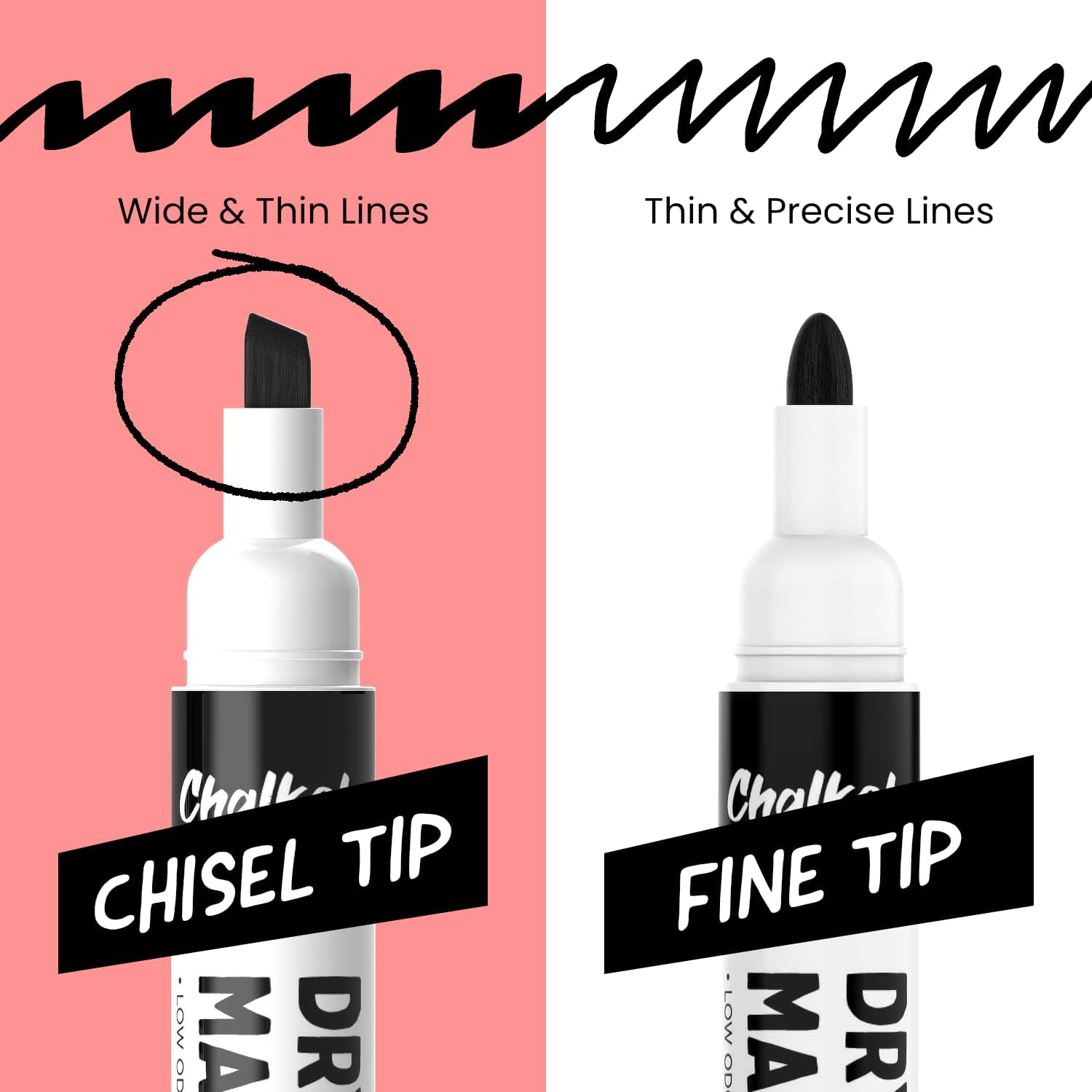- Erasable Markers for Whiteboard - Dry Erase Marker set that dry quickly, erase quickly with any cloth or dry eraser. Dry erase markers thin fine tip allows to make lines without any breaks, making them perfect for classrooms or conference rooms.