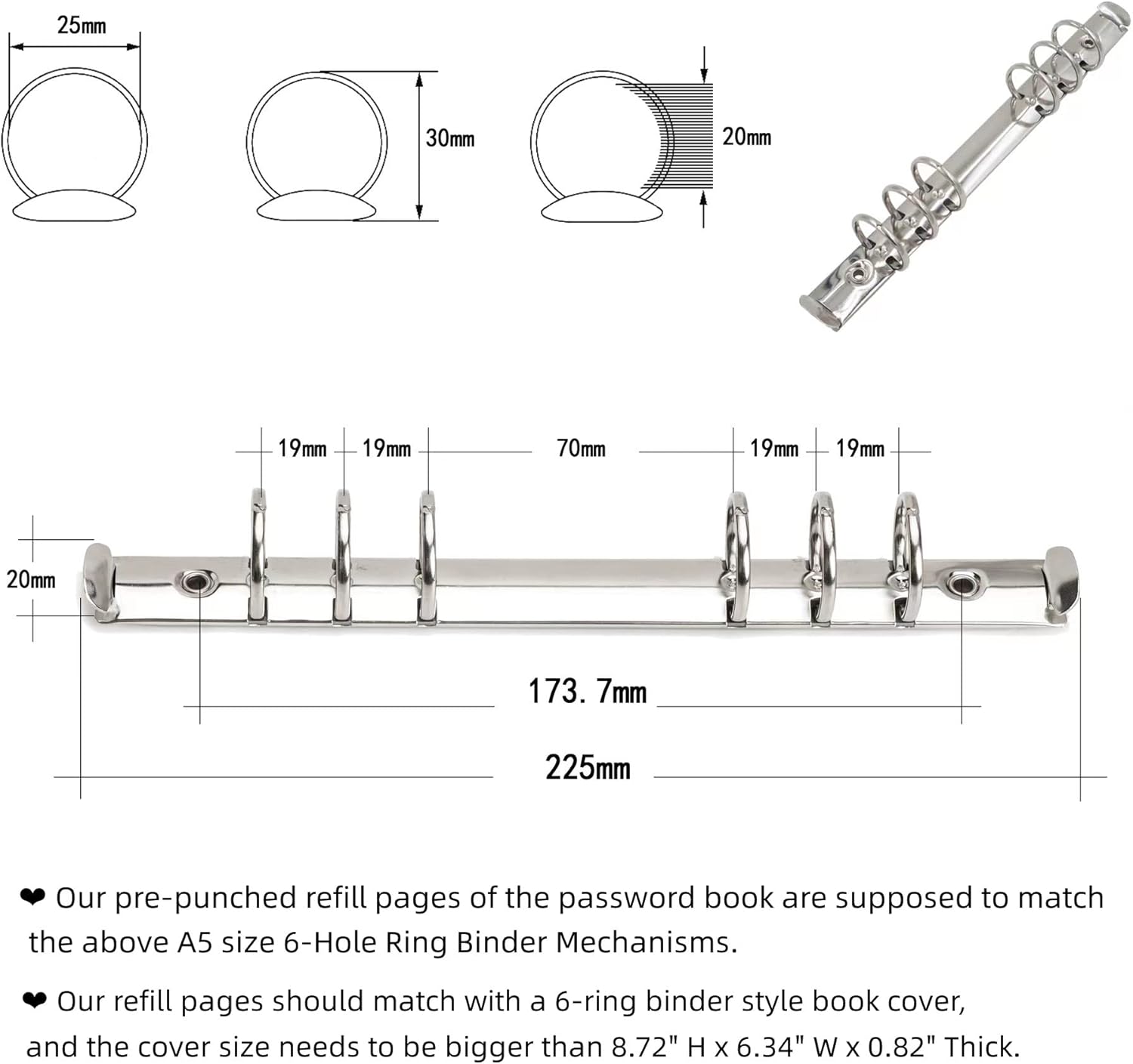 - Fits A5 6 Ring binder: Fits binder cover No smaller than 6.7" W x 9.25" H x1" Thick. Divider is 5.6” W x 8.19” H, inner page is 5.2" W x 8.2" H, 212 pages/106 sheets, both sides printing, 6 holes punched (hole space is 0.75in/19mm, hole space between 3rd & 4th holes is 2.76in/70mm, dia 0.197in/5mm). Suggest match this large print passwords book refills with A5 lockable binder whose size is large than 9.25"x6.7"x1" for perfect combination.