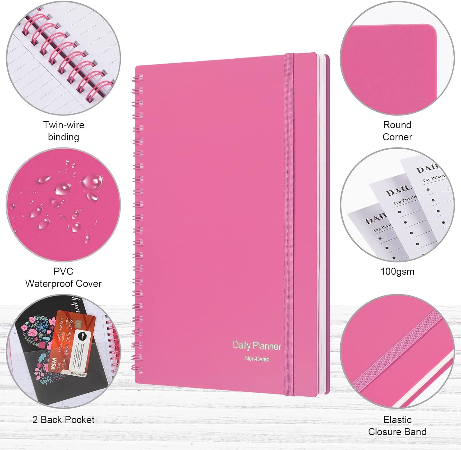 - Funtional Details:Sturdy PVC cover help protect the planner,elastic band keep the notebook close nicely or you can use the elastic closure to mark your page, two pocket in the back stroage your note receipts and cards,twin-wire binding allows turning pages smoothly and laying flat.