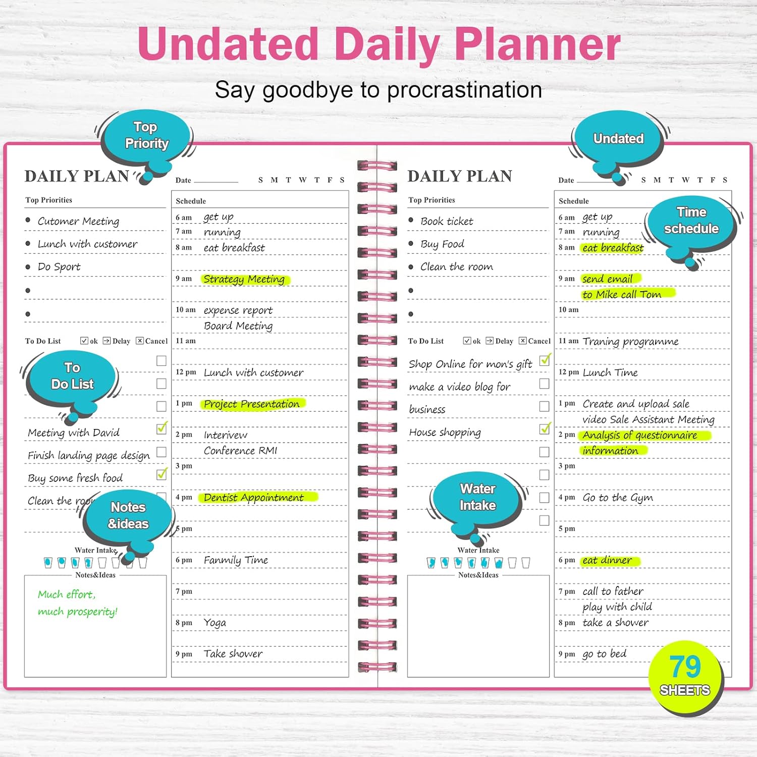 - Work Smarter with Daily Task Management: Each page includes space for 5 top priorities, 8 to do list,daily schedule from 6am-9pm, notes&ideas and water intake.Break your day into hours and help you work effective.
