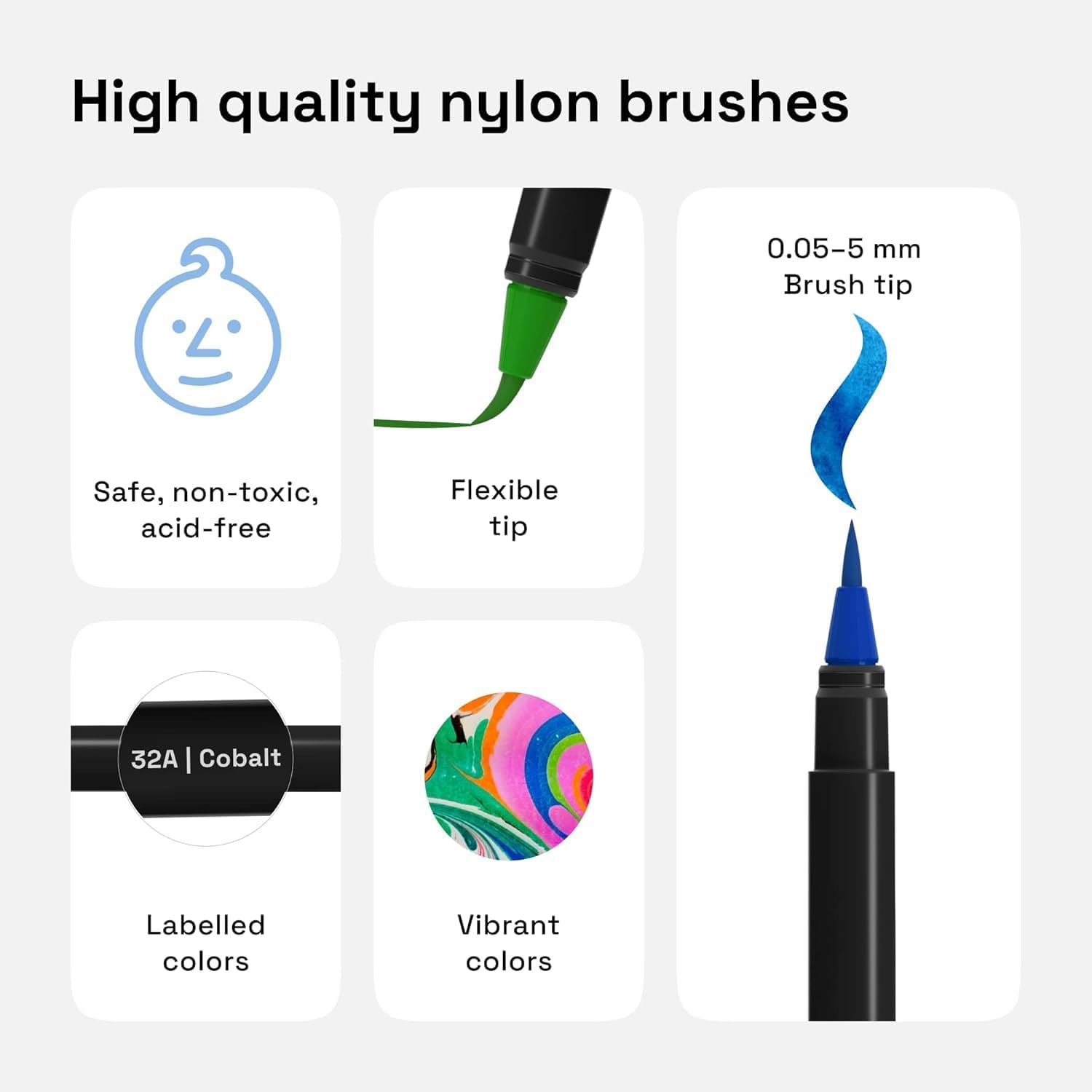 - HIGH QUALITY NYLON PAINTBRUSHES: The nylon brushes on these watercolor brush pens have 0.05-5 mm tips that are self-moistening, self-cleaning, and won't fracture. No need to wet the brushes, just paint and go!