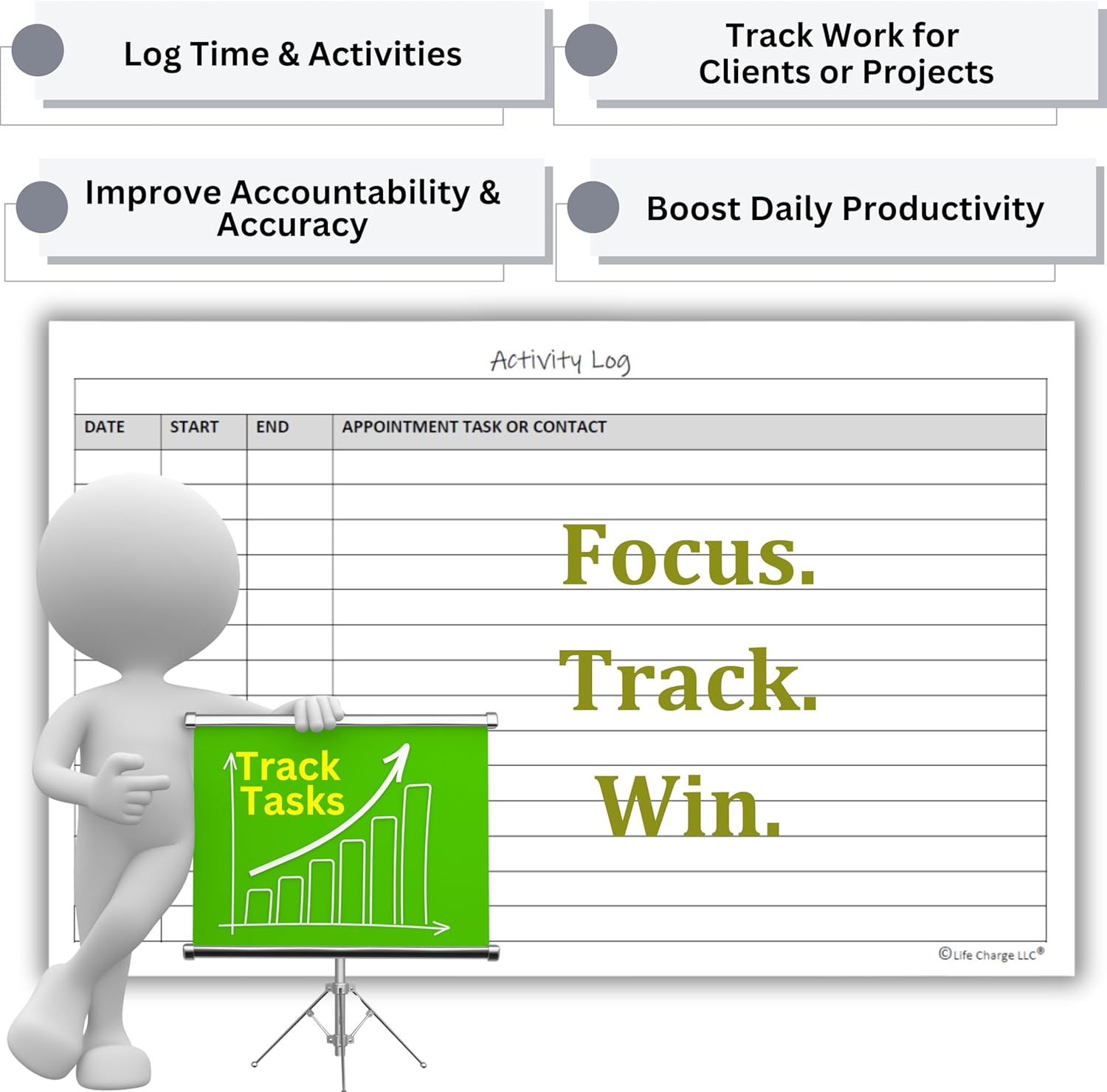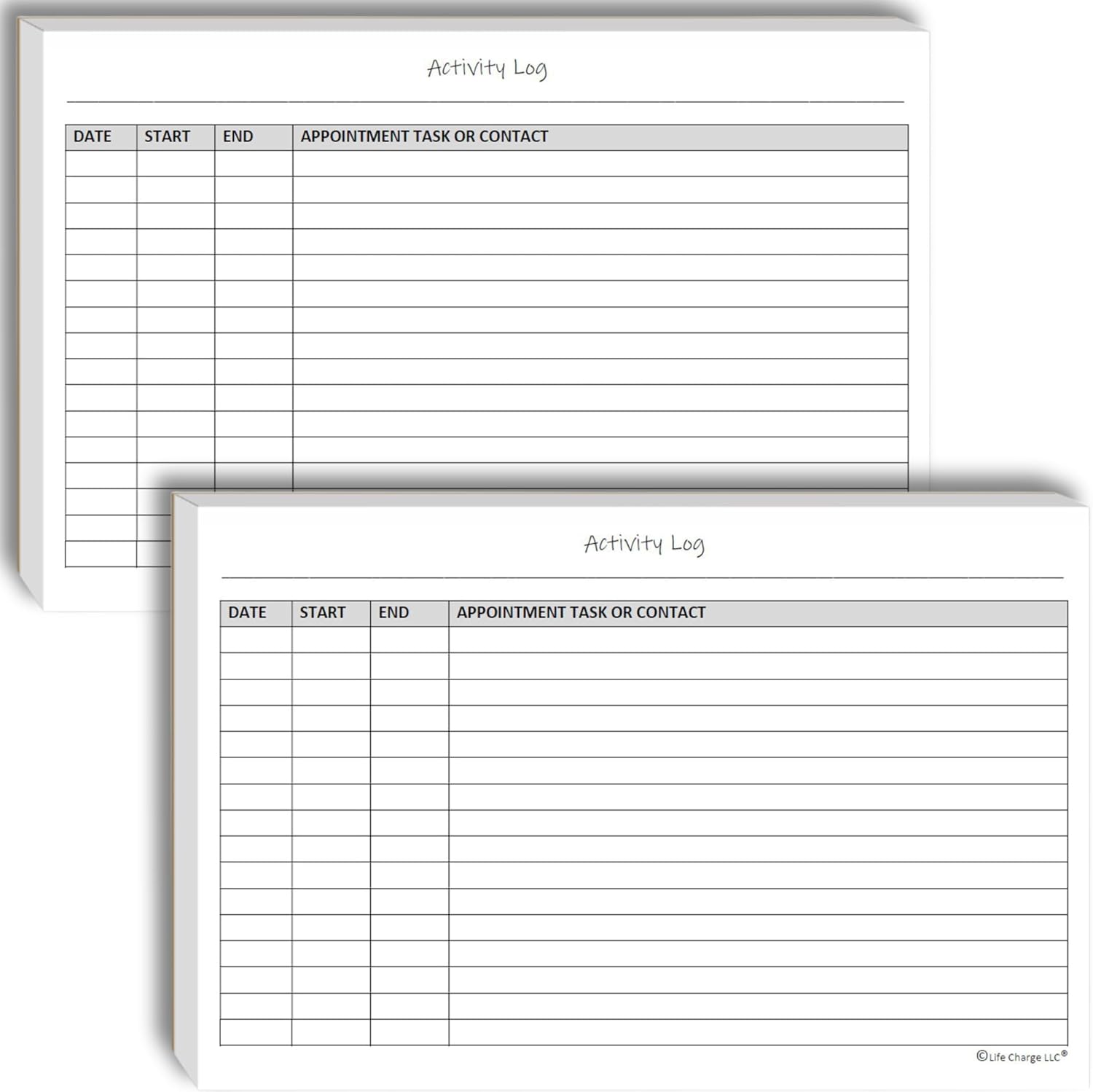 - Activity Log Notepad. These activity logs are helpful for work, home, personal and professional use. The format of this activity log allows for tracking date, starting time, and ending time. Use a single line or multiple lines to describe the appointment, task, or contact. It has a blank line at the top of each sheet to title each activity log sheet. Use one or many sheets for each project. FINALLY, a versatile activity log that can be used for many purposes and timeframes.
