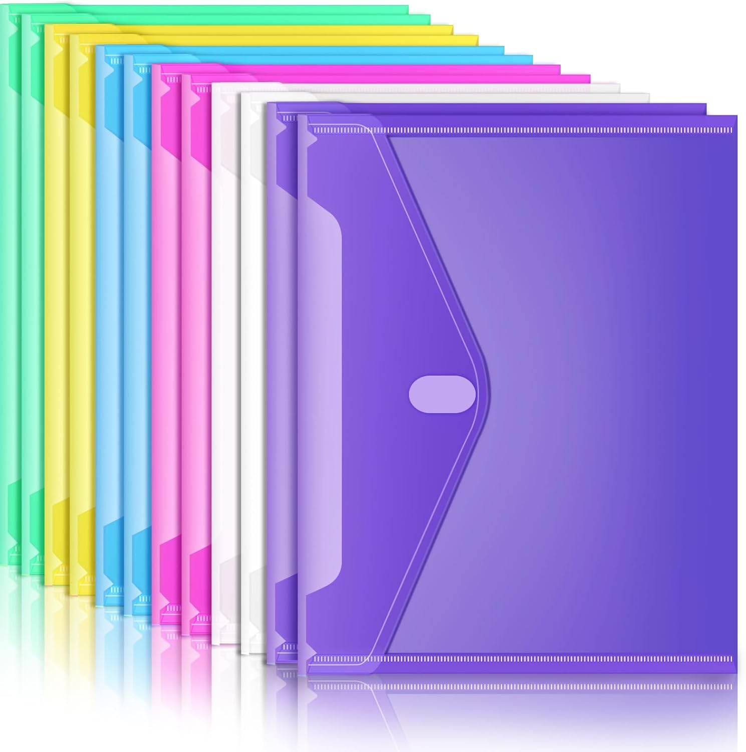 Sooez 12 Pack Plastic Envelopes Poly Envelopes, HeavyDuty File Folders, Clear Color Folders with Pockets, Folder for Documents Letter A4 Size, Filing Folders, Travel Bags, Office School Paper Storage