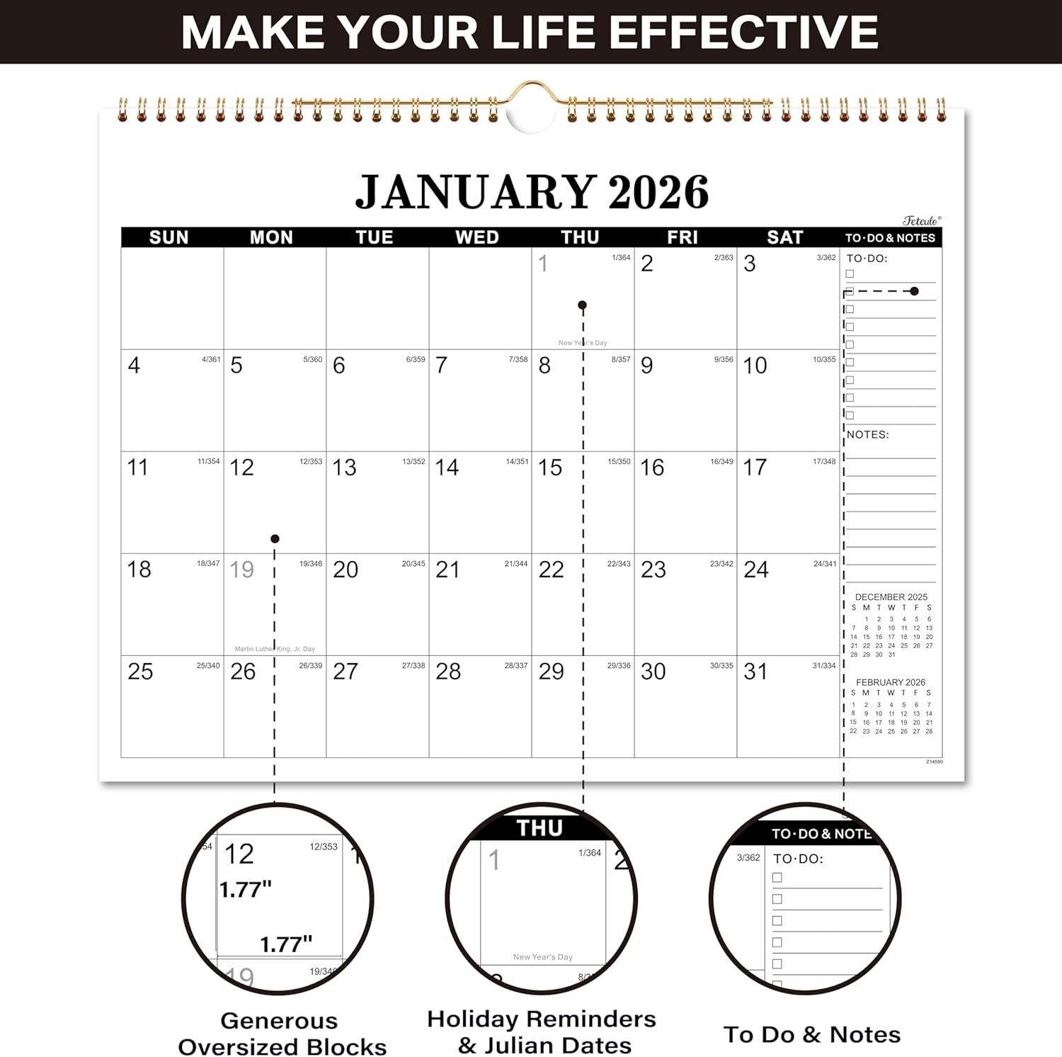 - π 2026 Calendar Monthly Page - Each page of this 18-month calendar has Large Daily Blocks (1.77'' x 1.77''), Notes Section, To-Do List for you to itemiz your monthly goals and important things. Besides, Highlighted Holidays and Julian Dates can inform you to arrange the holidays in advance and know the passed and the remaining days of the year.