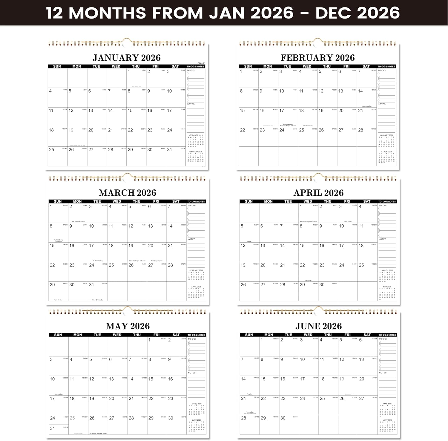 - π Sturdy Wire Binding - Calendar 2026 have sturdy twin-wire binding for turning pages easily and hanging hook for hanging calendar flexibly. The hard back cover can well protect the 2026 calendar.