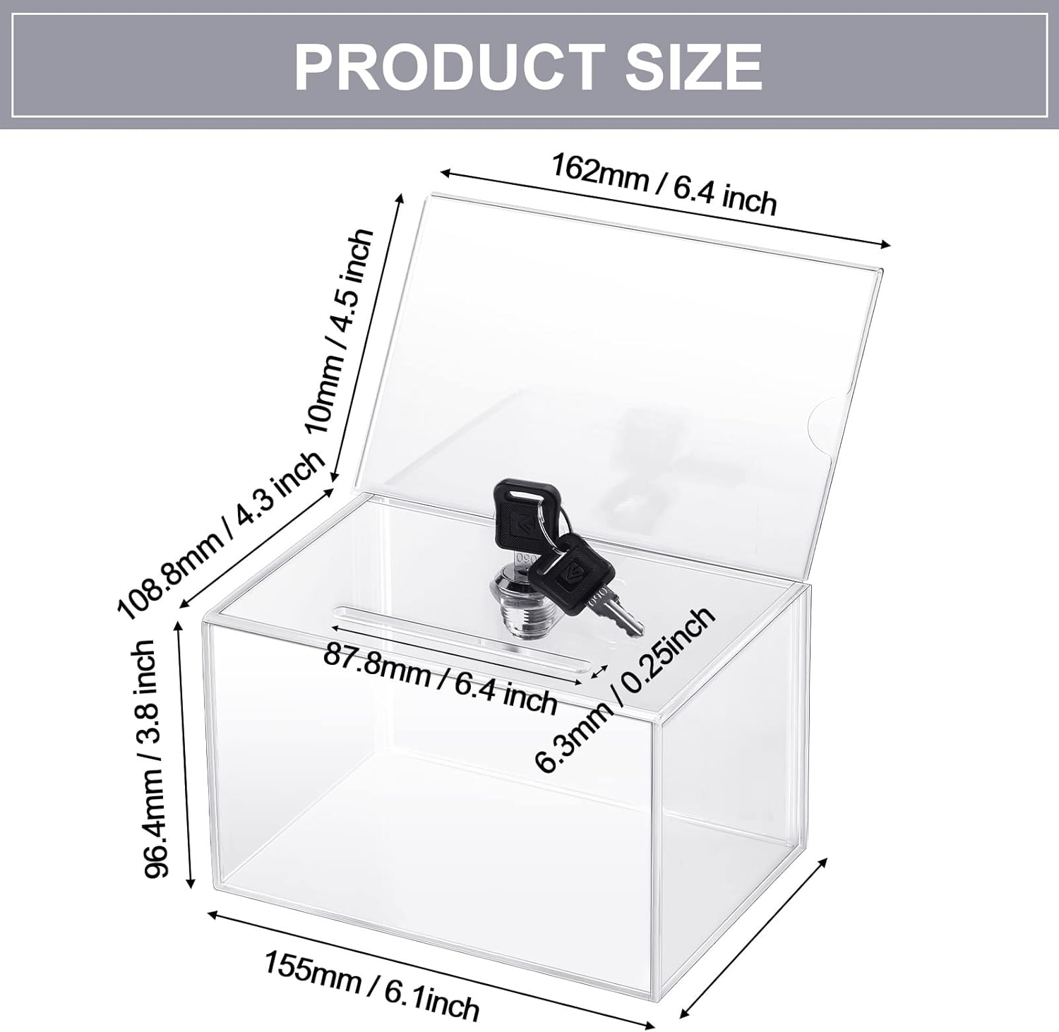 - Reliability and Safety: each acrylic suggestion box features a lock and 2 keys that can be applied to collect donations, suggestions or votes, while keeping the information inside safe and private, and the strong lock and keys will help keeping funds, checks, votes and suggestions, which will serve you for a long time