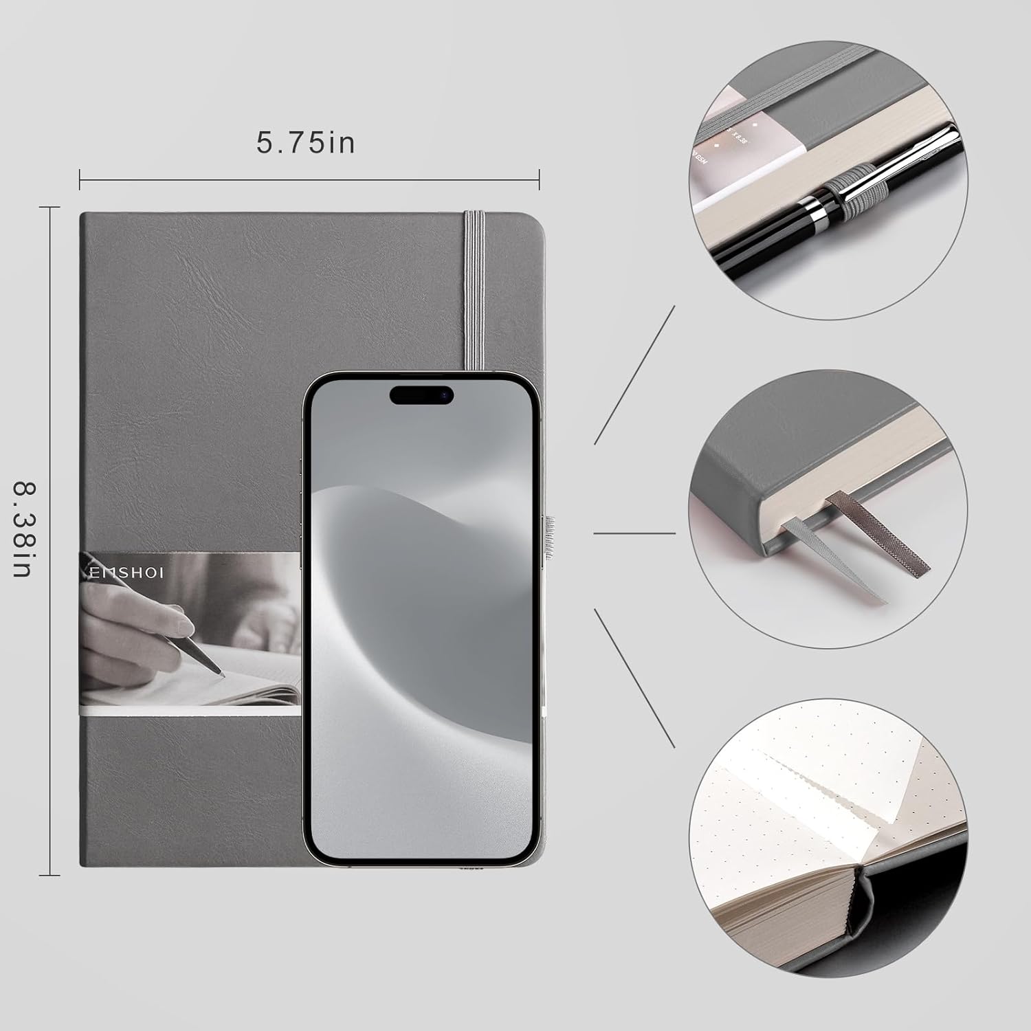 EMSHOI Dotted Notebook - 256 Pages A5 Dot Grid Journal Bullet Notebook with 120gsm Thick Dotted Paper,16 Perforated Pages, Hardcover Leather, Pen Holder, Inner Pocket, 5.75'' × 8.38''-Dark Grey