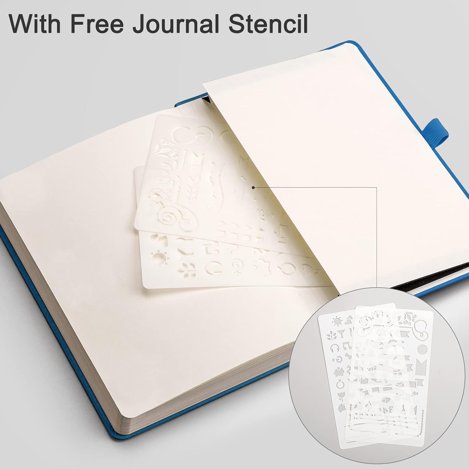 - A5 Dotted Notebook Features: Each Journal comes with an elastic closure,1 pen holder loop, 2 bookmarks, 1 back pocket, 2 journal stencils, and a humane rounded arc corner design