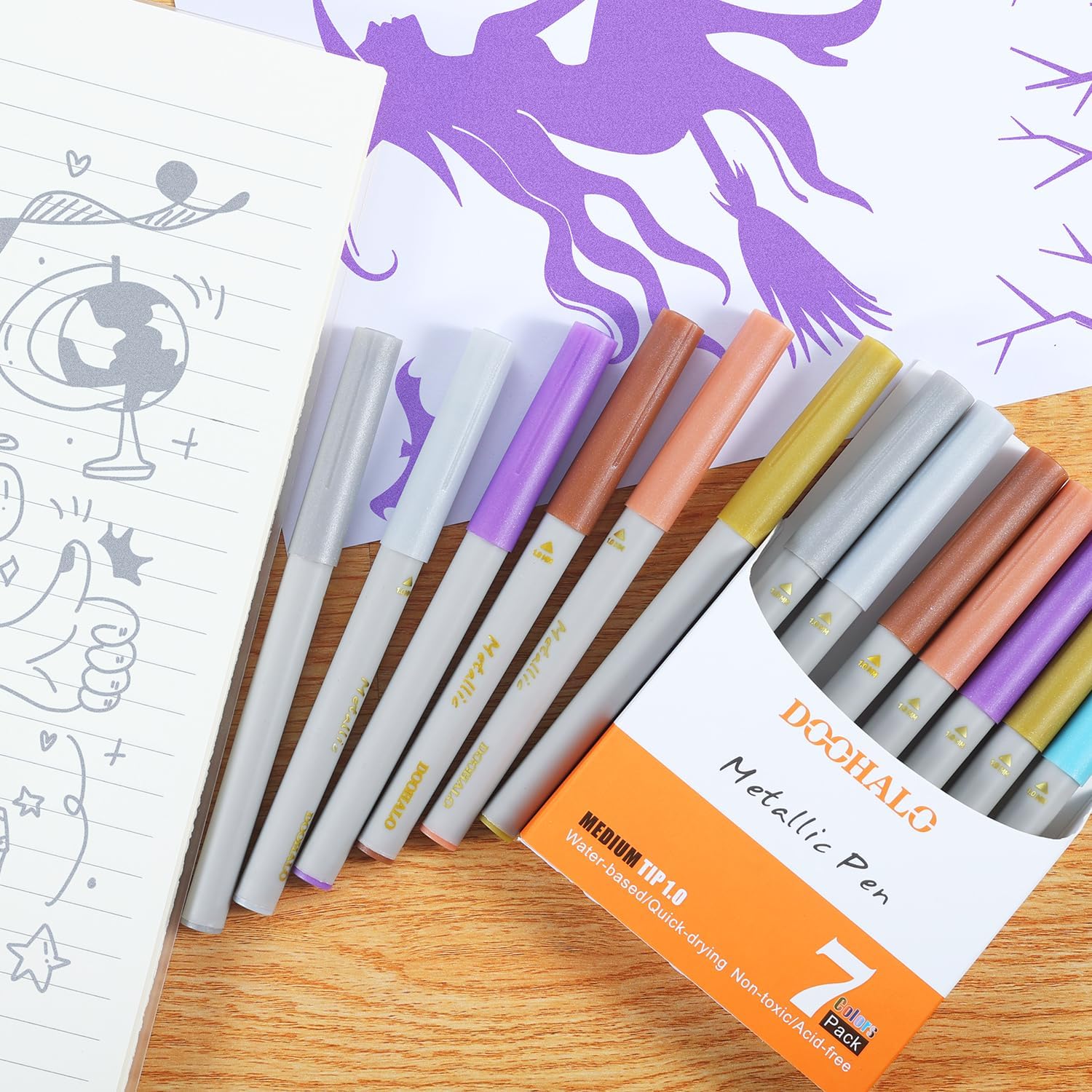 - SEVEN COLOR VARIETY PACK: Available with 7 pens pack in 7difference color, which includes 7 medium point metallic markers in Gold, silver, Copper, Blue and Rose. Presented inMetallic gold, metallic silver, metallic red, metallic copper, metallic green, metallic violet.