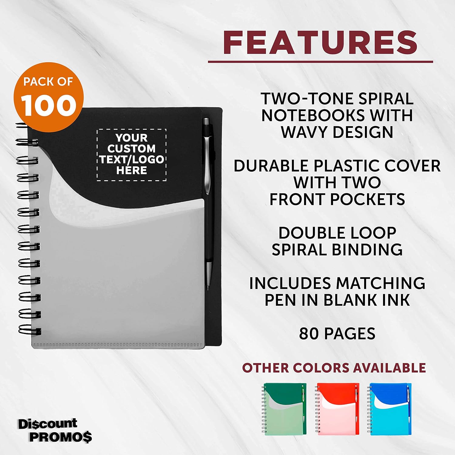DISCOUNT PROMOS Custom Spiral Notebooks with Front Pocket Set of 100, Personalized Bulk Pack - Durable Plastic Cover, Includes Matching Pen in Blank Ink, Perfect for School, Office, Home - Black