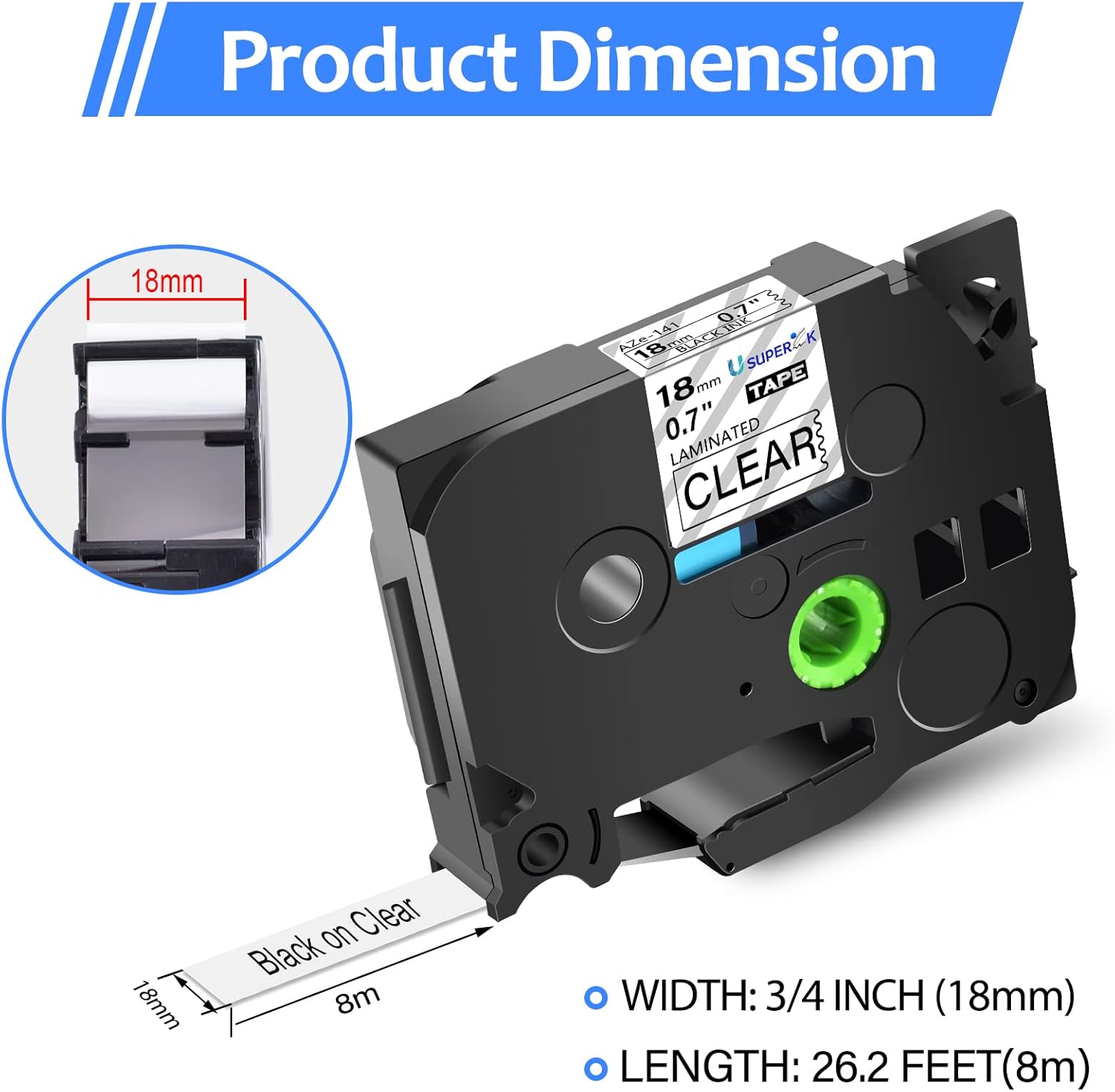- Color: Black Text on Clear Background, Length: 8m (26.2 feet), Width:18mm (3/4 inch or 0.7'')