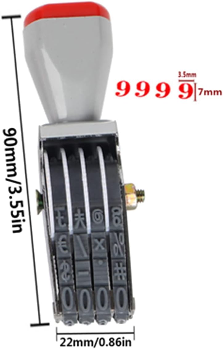 - Number stamp, Material : Metal, Rubber, Plastic; Size:length :90 mm/3.54 in,width:20 mm/0.78 in,High:25 mm/0.98 in, Character : Width:3.5 mm /0.13 in,Height:7 mm/0.27 in, Color : Gray black, Weight: 42 g, Package Content : 1 X Numbering Stamp ( (ink not included, an additional ink pad is required when using).