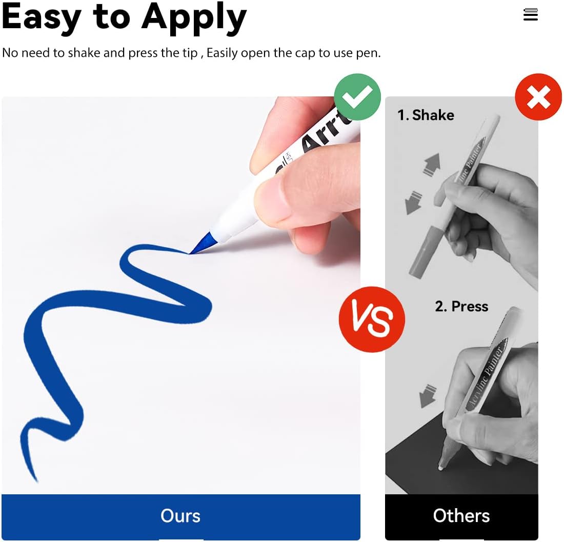 - Easy to Apply, No Pressing Down,No Shakin: With new design, these pens are very easy to apply and no need to shake and press for tips while using, you only need to open the cap to use pen.Round pen body made it comfortable to grip.