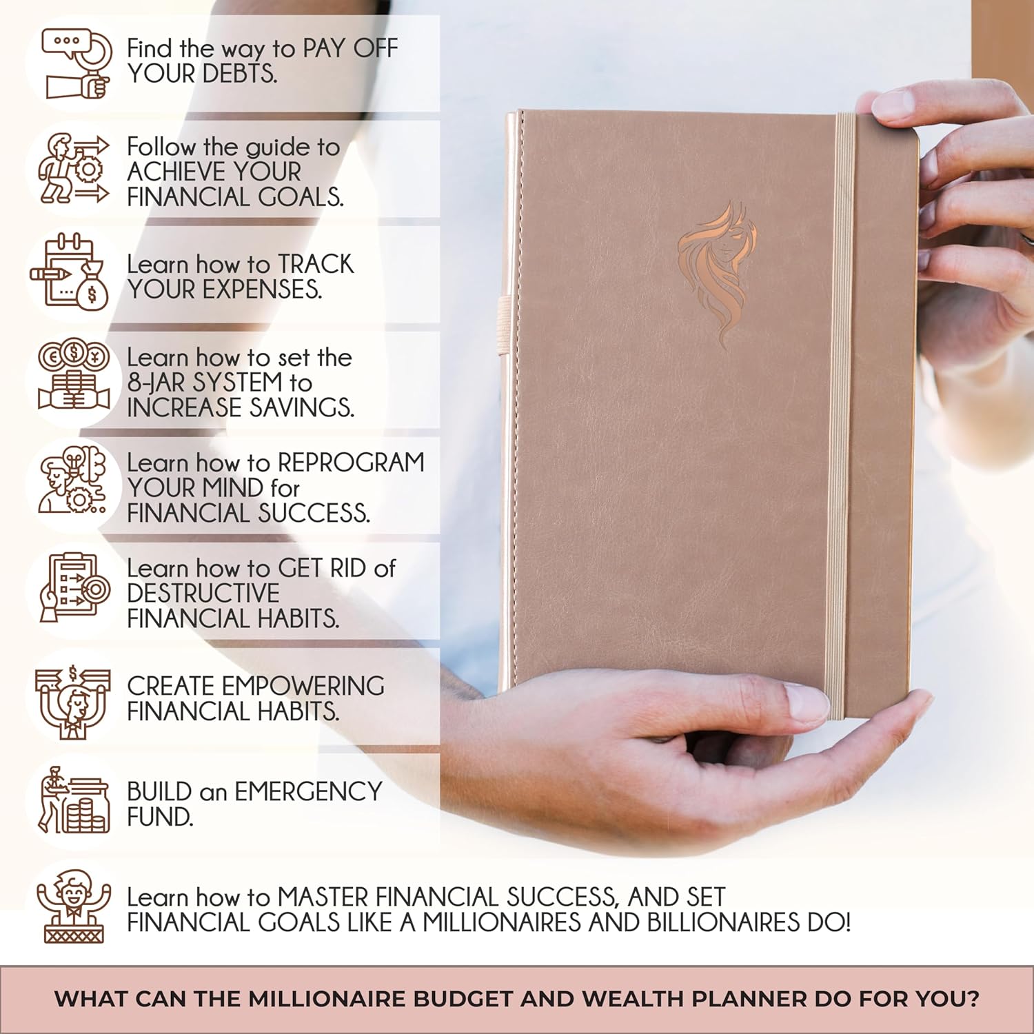 - BUDGET PLANNER WITH CASH ENVELOPES - This deluxe financial planner is an undated budget and wealth planner, measuring A5 Size (5.8 x 8.3 inches). It boasts a vegan leather hardcover, thick paper 100 gsm, 3 sheets of stickers, pen loop, elastic band, receipt pocket, and 8 pcs budgeting cash envelope system. Designed to guide you in reprogramming your mindset for financial success, it assists in managing debt, tracking expenses, boosting savings, and establishing an emergency fund.