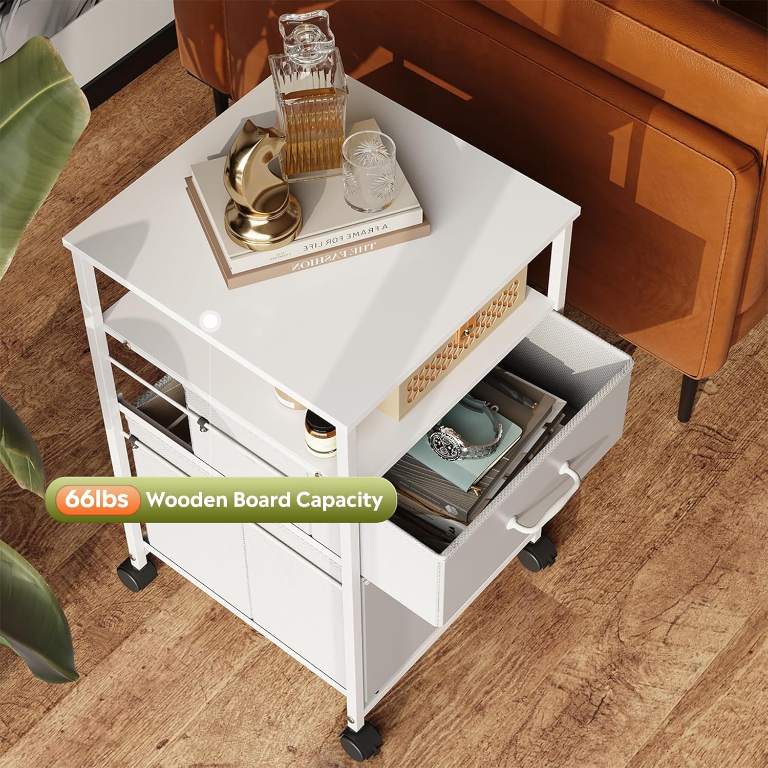 - Easy to Move: Rolling on 4 wheels, this mobile file cabinet can fix or move around your home office freely. Built-in brakes on front 2 casters to keep it in position and add stability. Unique fabric drawer design makes it only weigh 22 lbs. and light to move.