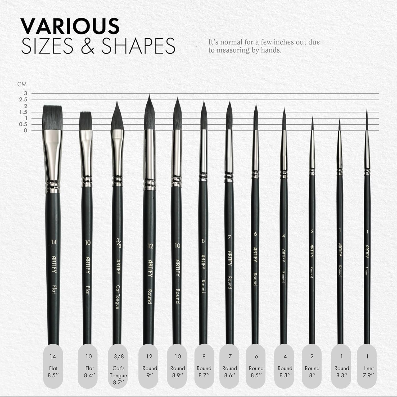 - SELECTED COLLECTION OF SHAPES AND SIZES: To bring up fresh inspiration, ARTIFY has selected 12 different shapes and sizes of brushes as a set. The paint brushes will satisfy you whether you are doing detailed painting or large coat applications, every stroke will come to life