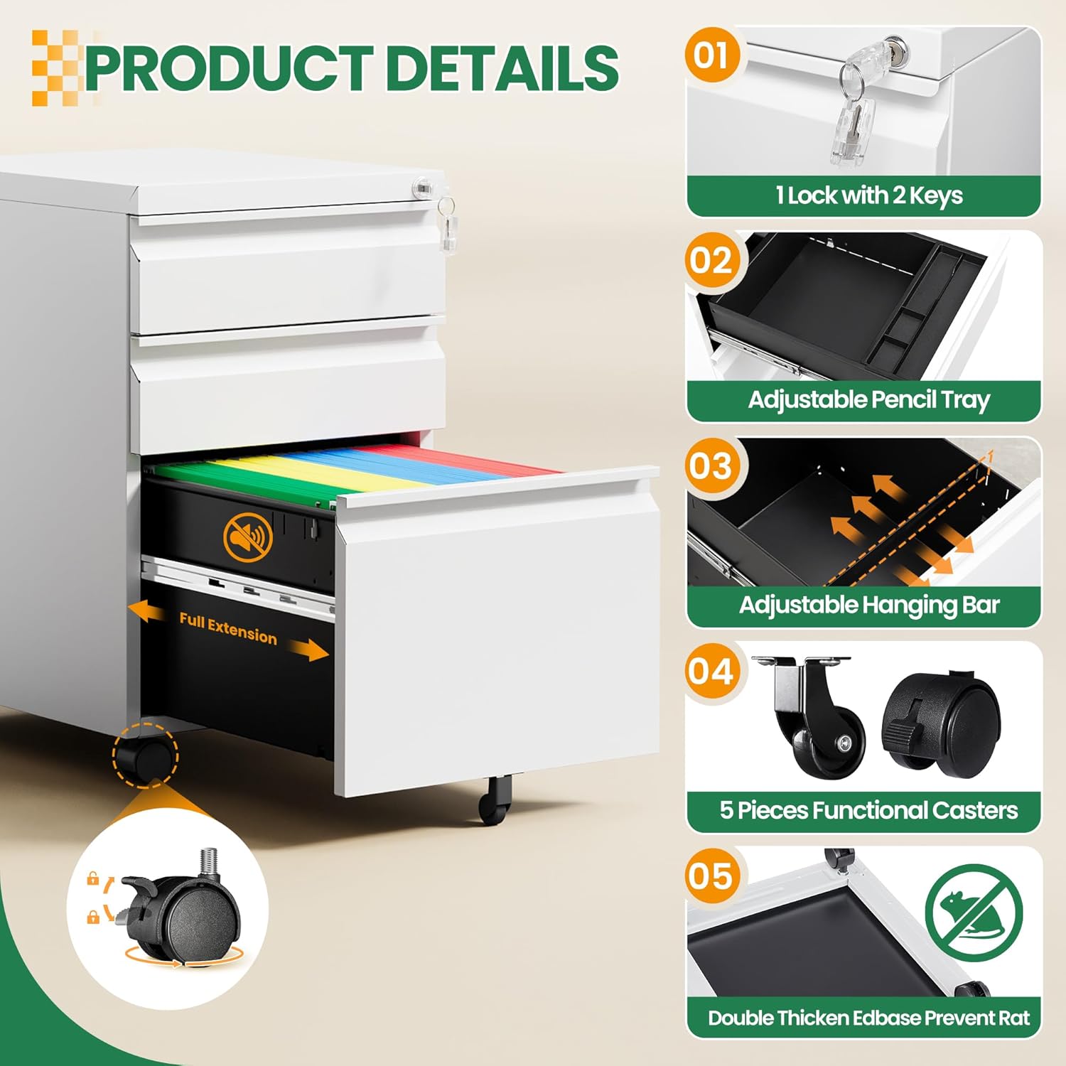 - ăBulit-in Lock ă This vertical file cabinet with a built-in lock that secures all three drawers, keeping your personal documents, receipts, important papers and bills in safe and organized.