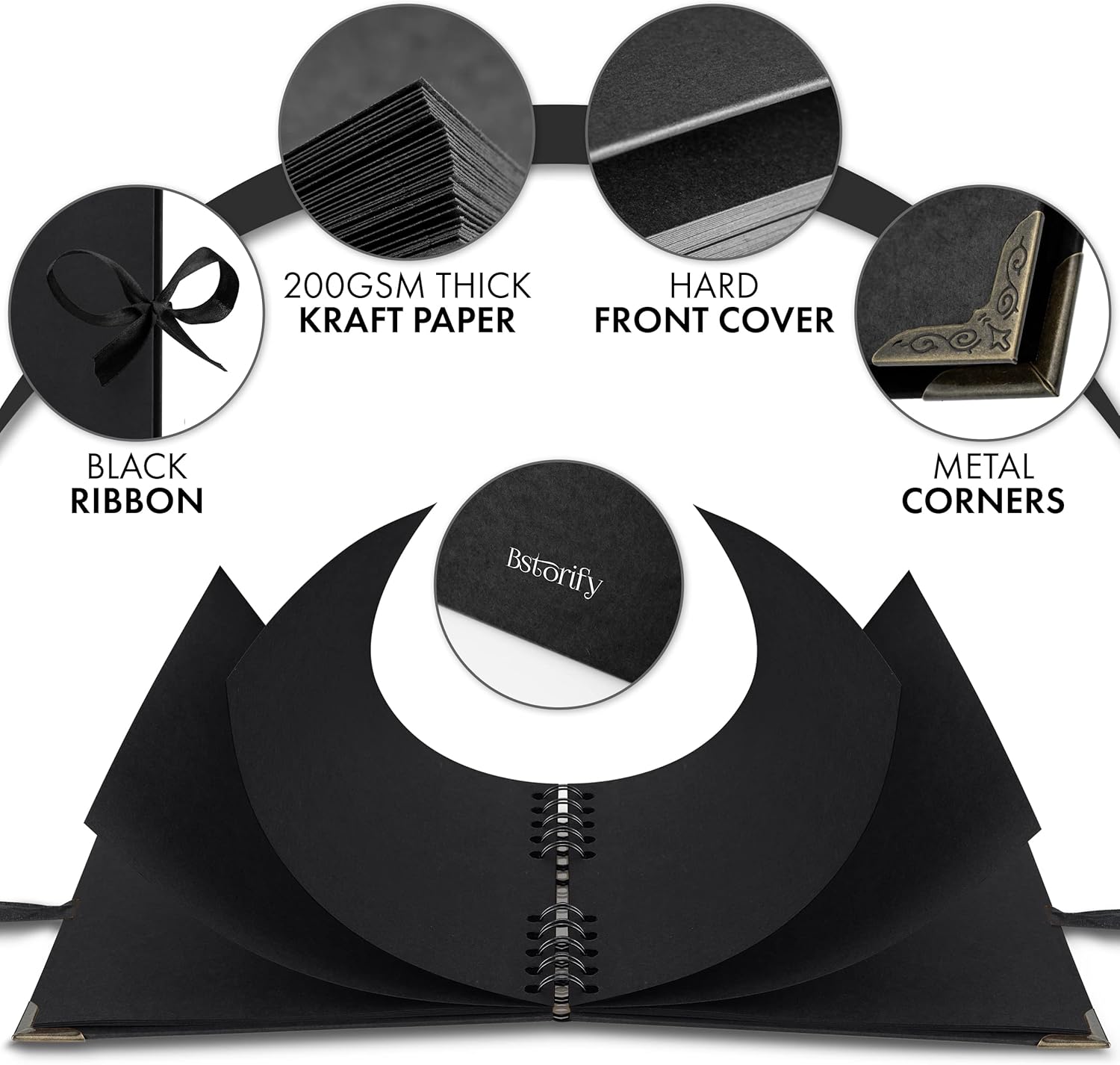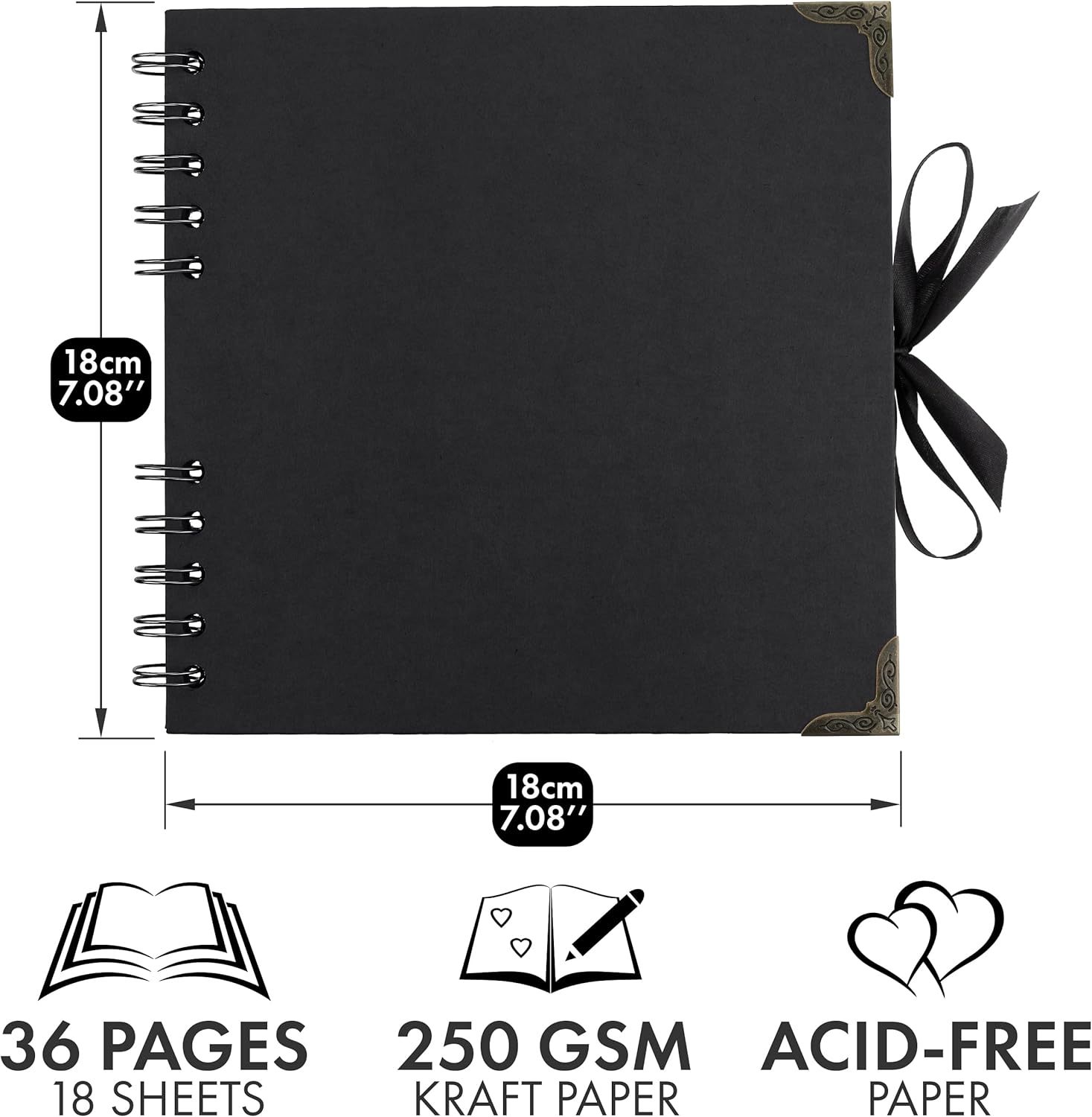Bstorify Square Scrapbook Photo Albums 36 Pages (7 x 7 inch) Black Thick 250gsm Kraft Paper Scrap Book, Memory Book, Ribbon Closure - Ideal for Your Scrapbooking Albums, Art & Craft Projects