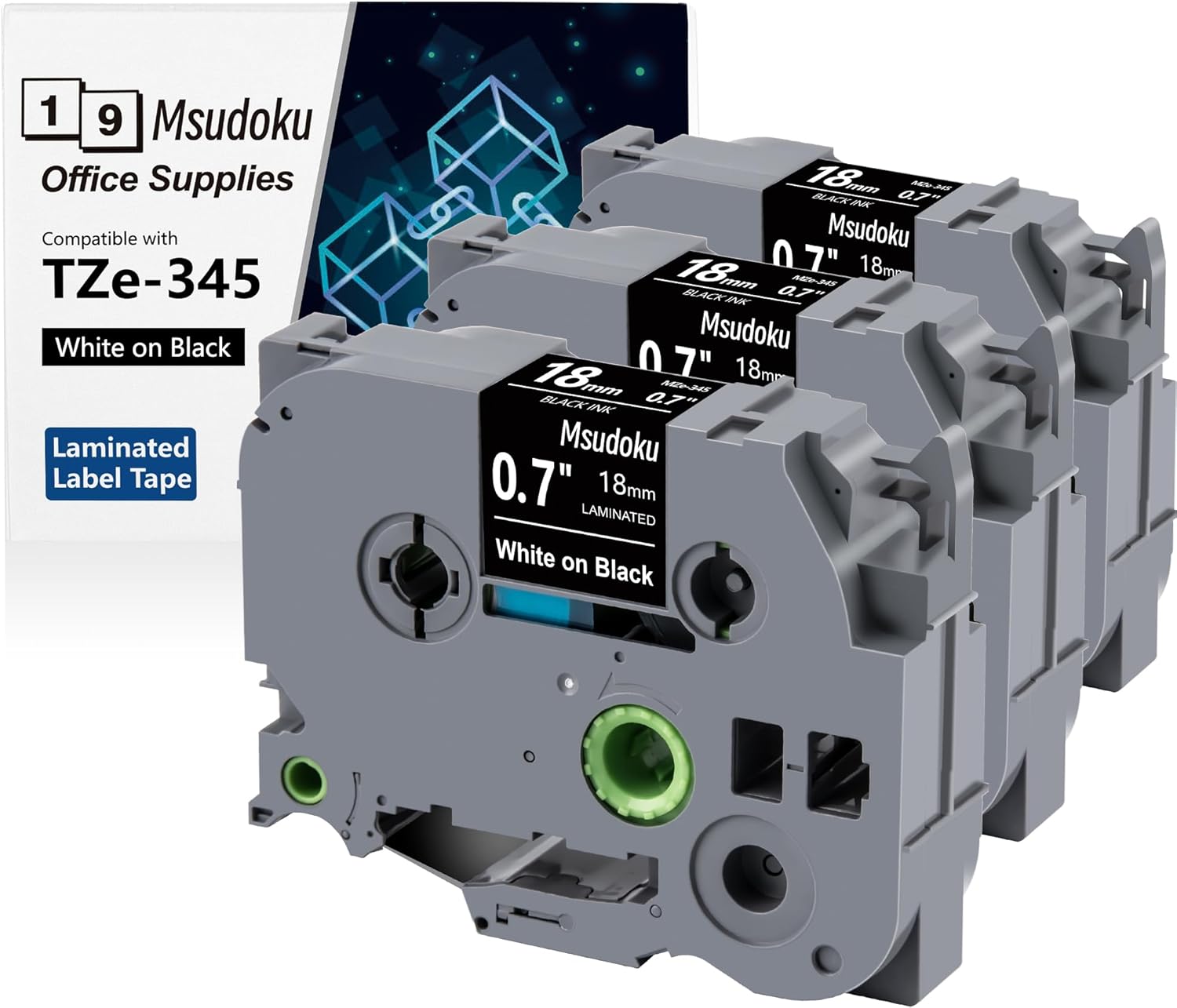 Tze Tz Tape 18mm 0.7 Laminated Black Compatible for Brother P Touch Label Maker Tape TZe-345 TZe345 Label Tape for PT D400 D600 D610 P710BT, White on Black, 3/4 Inch x 26.2 Feet, 3-Pack