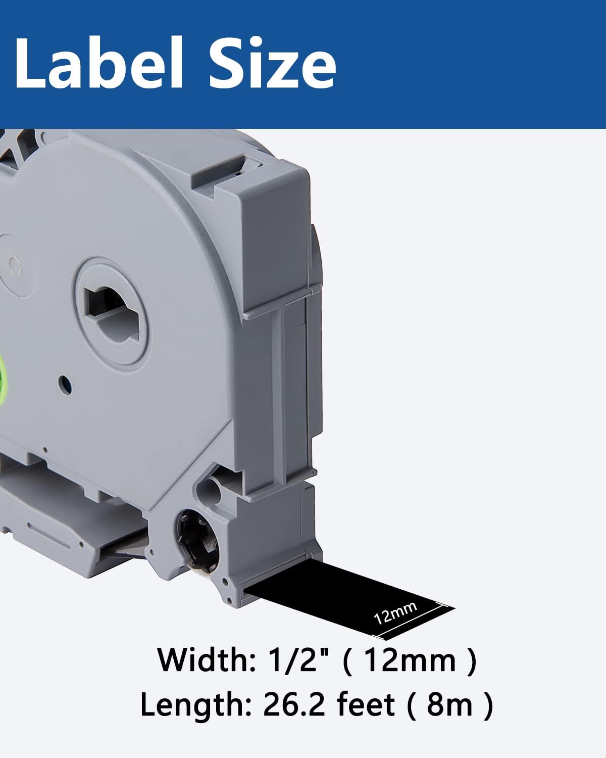 - Size - 1/2" width x 26.2' length ( 12mm x 8m ) each 12mm label maker tape. Color - White ink on black tape