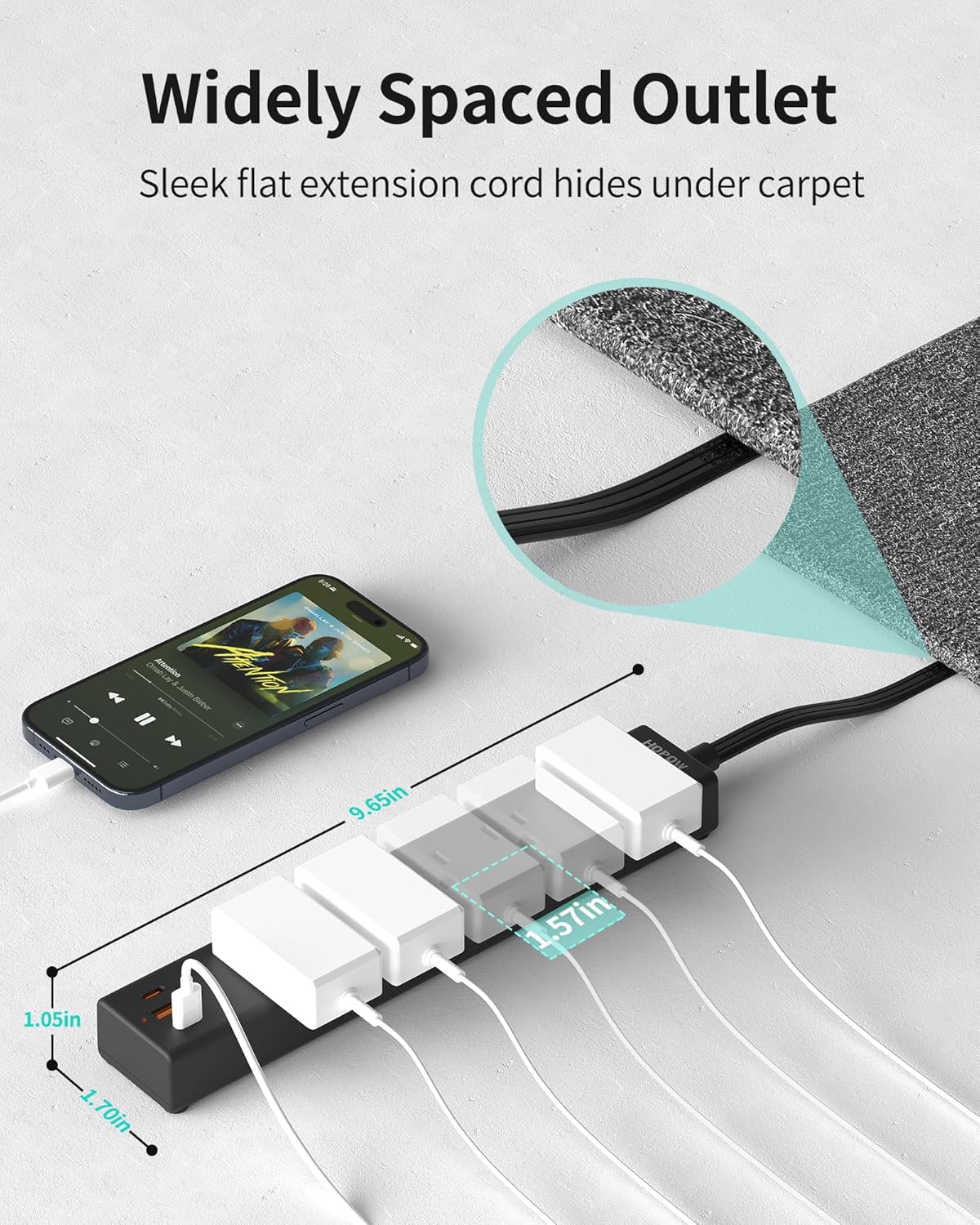 - [Extremely Thin Extension Cord]-The 6-foot flat cable is 50% thinner than the traditional power cords to run it under a rug or along walls without adding unsightly bulk or creating a trip hazard. It can keep unsightly cords hidden and allows furniture placement without having to accommodate them.