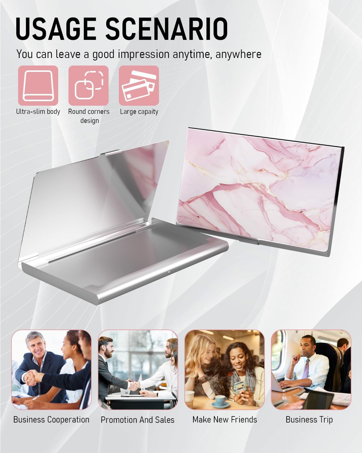 Business Card Metal Slim Organizer, Professional Stainless Steel Square Pocket Wallet for Office Workers, Compact and Portable for Pockets (Pink Marble