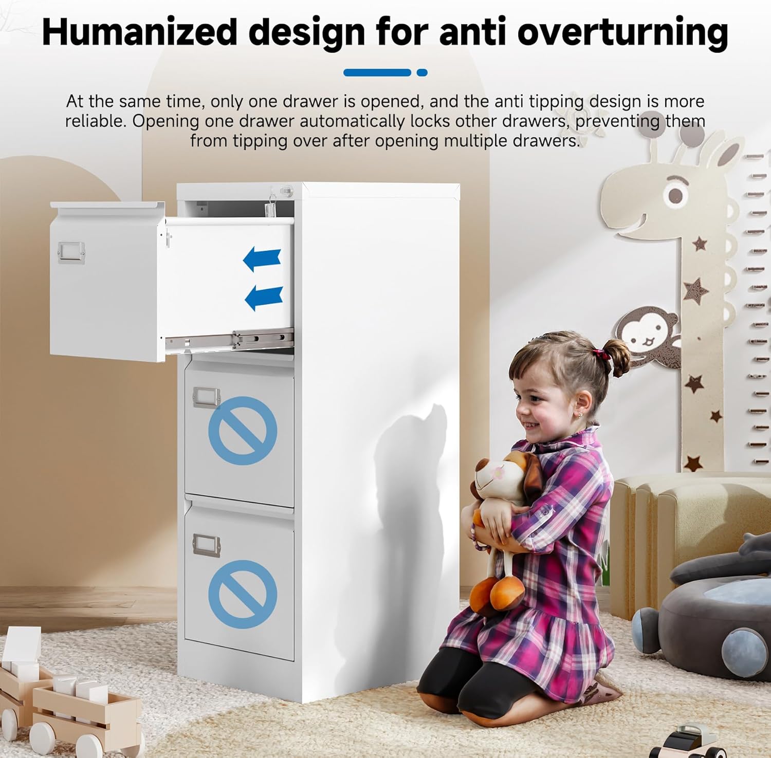 - ăHIGH SECURITYăThis file cabinet can lock 3 drawers at the same time with one lock, and is equipped with 2 keys. With an anti-tilting mechanism, when 1drawer is opened, the interlocking system prevents the other drawer from opening, thereby preventing tipping and protecting your safety.