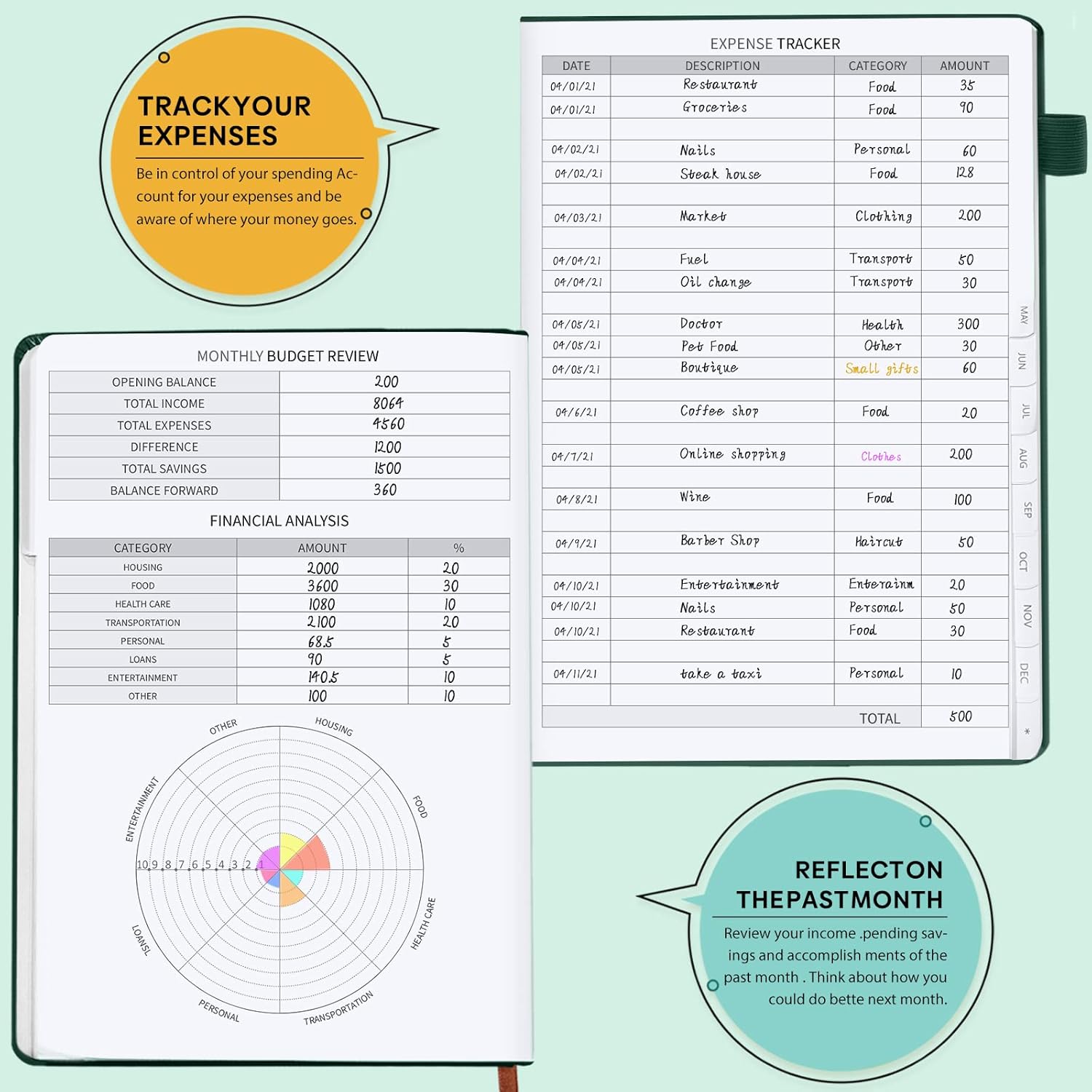 - FUNCTIONAL PERSONAL FINANCE WITH MONTHLY TABS: The financial ledger starts with 1 page of financial goals, 1 page of categorized financial strategies, 4 pages of expense tracker, 1 page of monthly reflection, 1 page of notes, through the 12 month plan, additional multiple layouts combined with annual summaries, monthly separator tab to track progress throughout the year, enabling a year-round perspective,