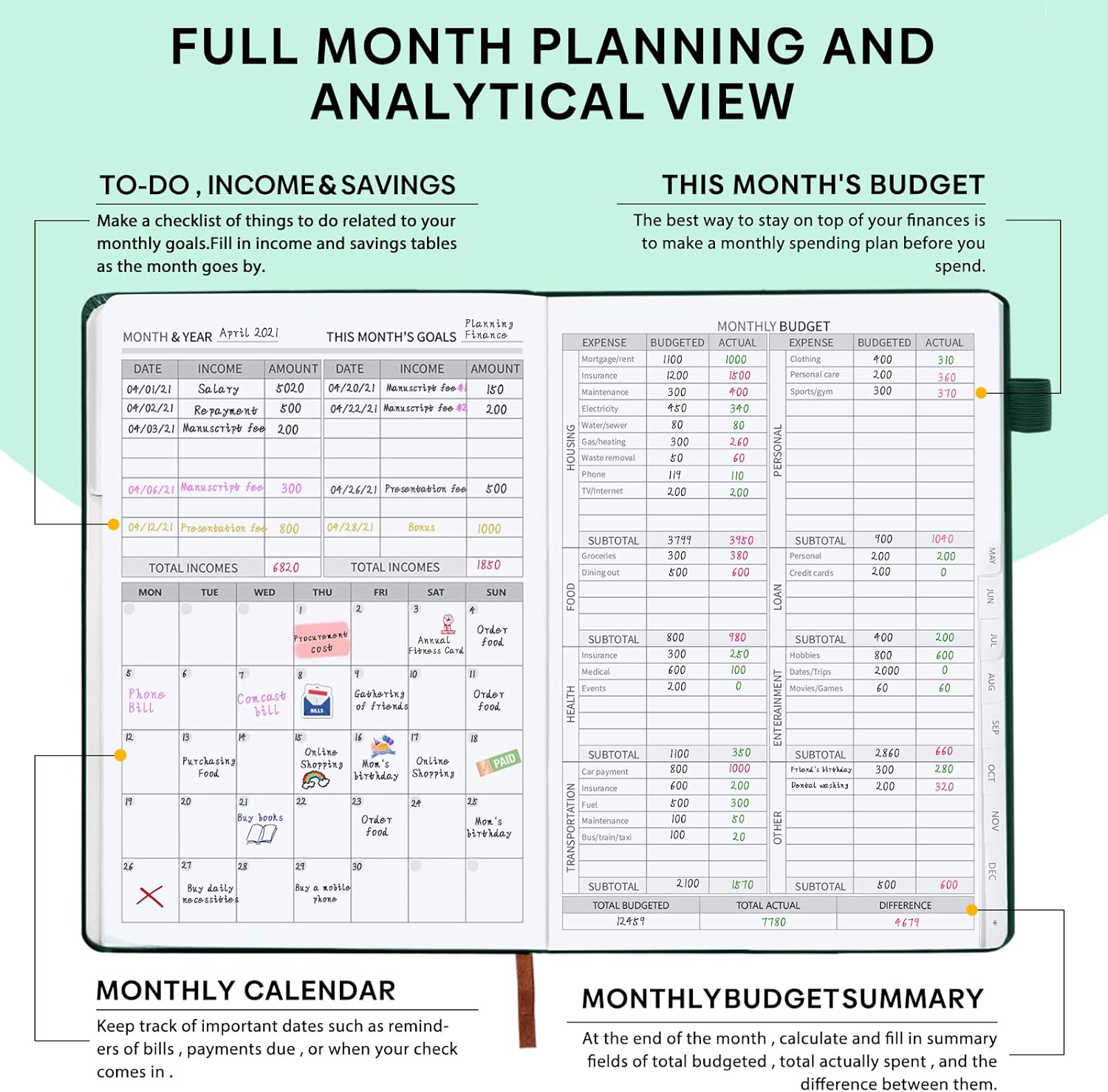 Budget Planner with Monthly Tabs - 7" x 10" Hardcover Budget Book, Monthly Bill Organizer with Pockets, Undated Finance Planner with Expense Tracker Notebook to Take Control Your Money-Dark Green
