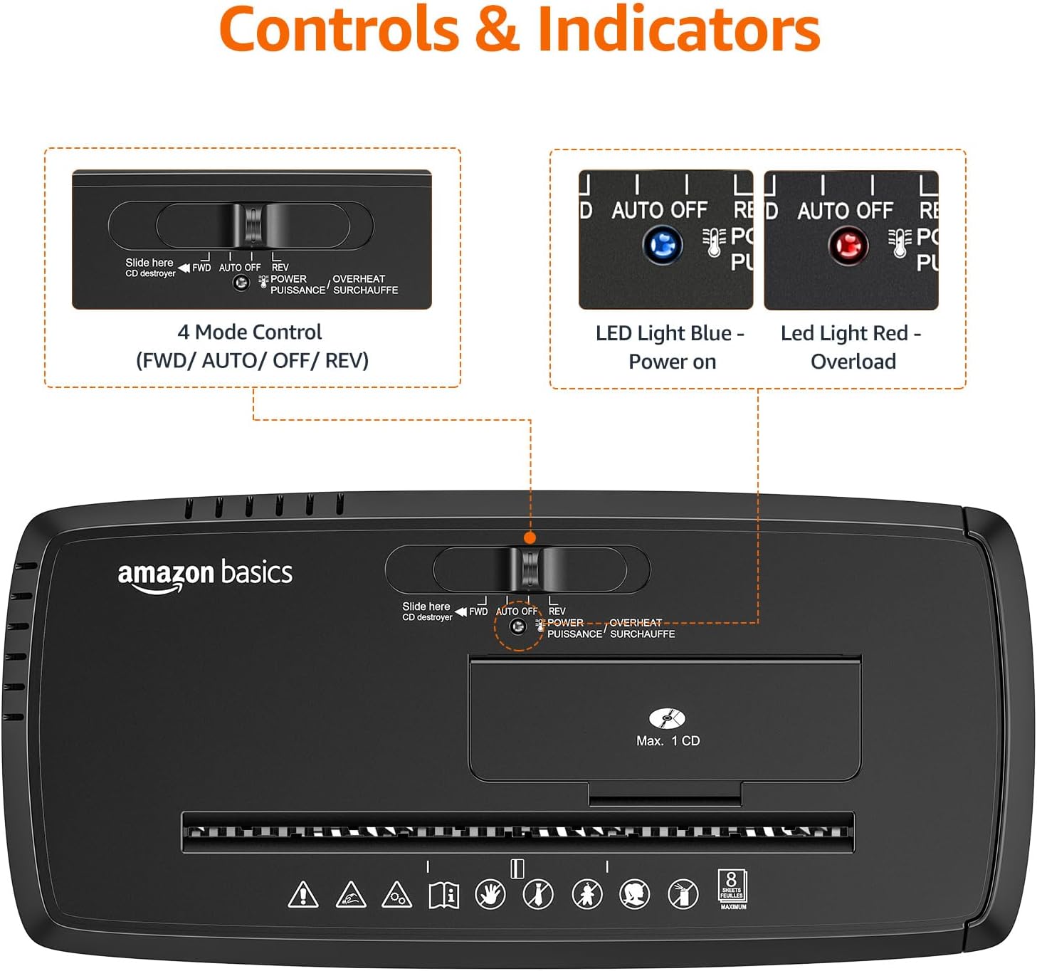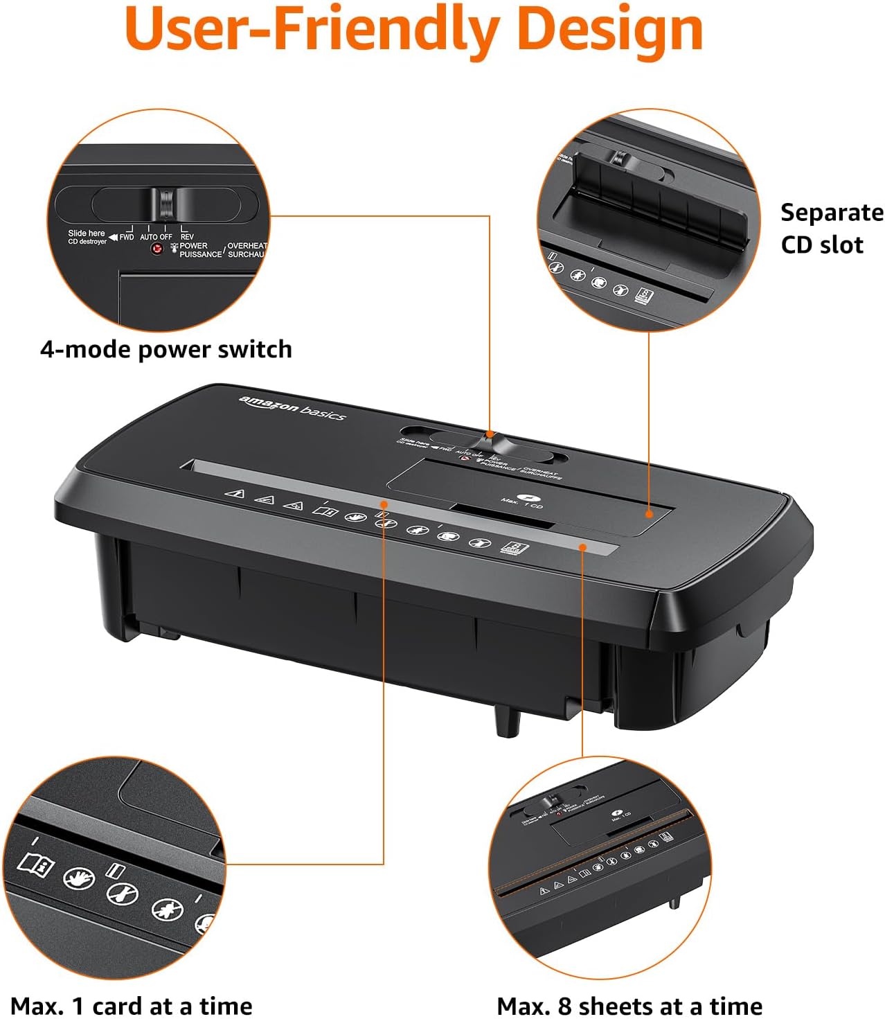 Amazon Basics 8-Sheet Strip Cut Paper, CD, and Credit Card Shredder with Auto-Off Compact, Portable Design, No Basket, Extendable Arm, Black