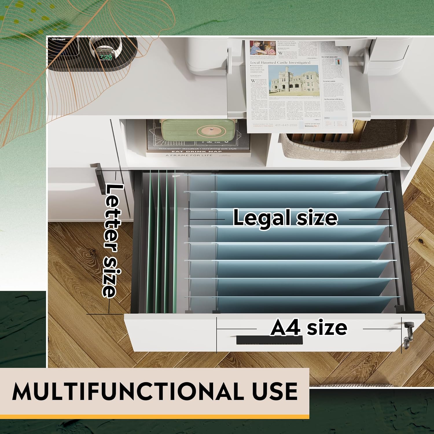 - File Drawer with Lock: The full-extension file drawer accommodates Legal/letter/A4 sized documents and features smooth ball-bearing slides that allow you easy access to all files. This locking file cabinet comes with 2 keys to secure important documents and protect the privacy of your business.