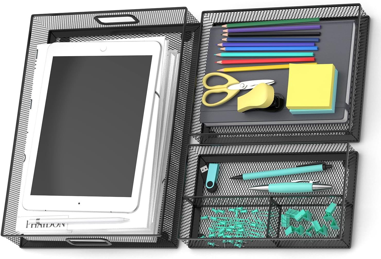 - Multiple Compartments: Perfect for office supplies, such as pens, paper clips, and other small office supplies. Additionally, the largest organizer can accommodate A4-size papers(magazines), notebooks, files, and other larger items.