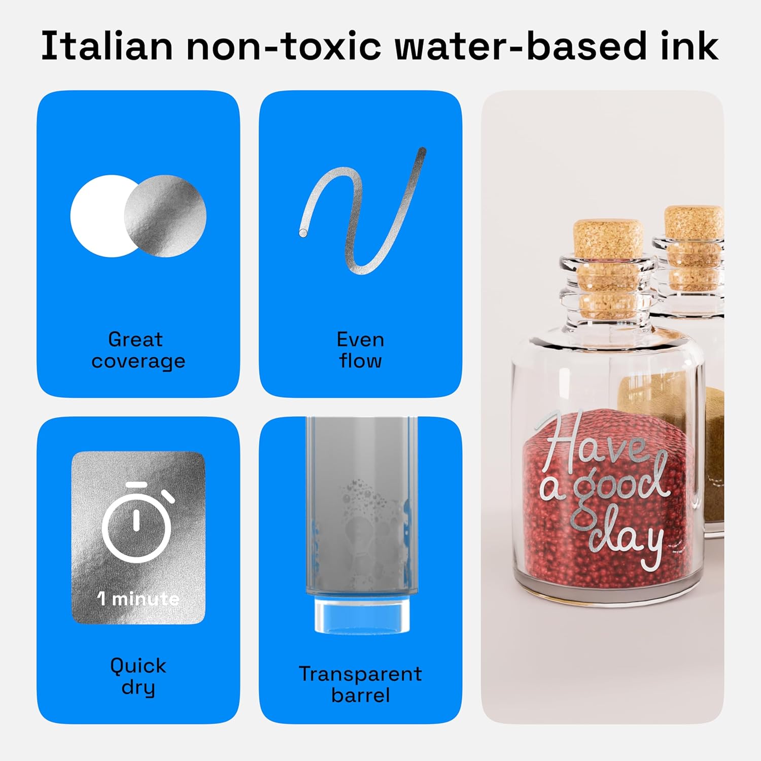 - PREMIUM QUALITY: This Artistro 2-pack of medium fine silver acrylic paint pens utilizes vivid, acrylic ink that dries quickly to produce a durable opaque and glossy finish on any surface. Each acrylic paint pen is equipped with Italian ink and a durable Japanese nib.