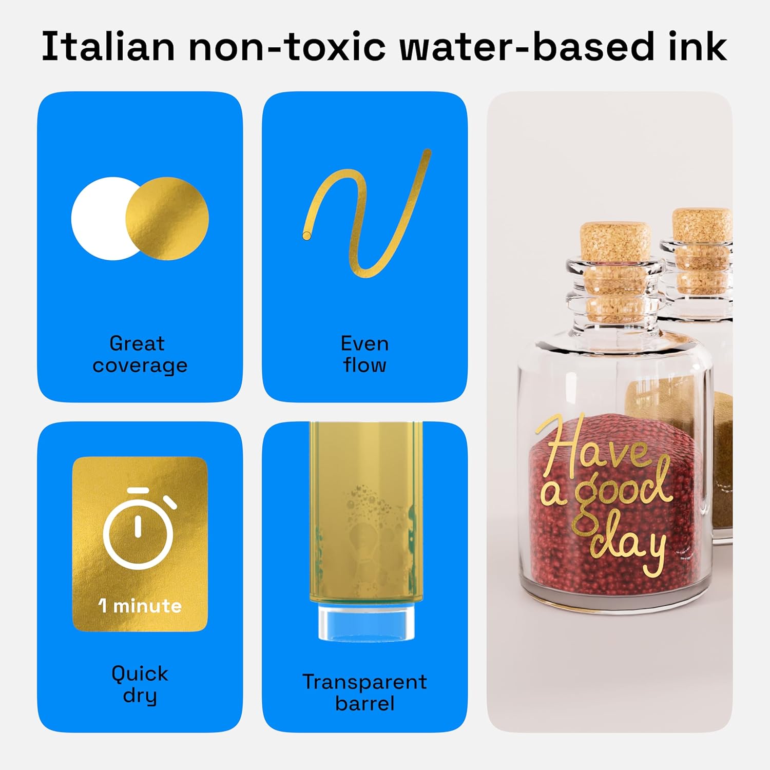 - PREMIUM QUALITY: This Artistro 2-pack of medium fine gold acrylic paint pens utilizes vivid, acrylic ink that dries quickly to produce a durable opaque and glossy finish on any surface. Each acrylic paint pen is equipped with Italian ink and a durable Japanese nib.