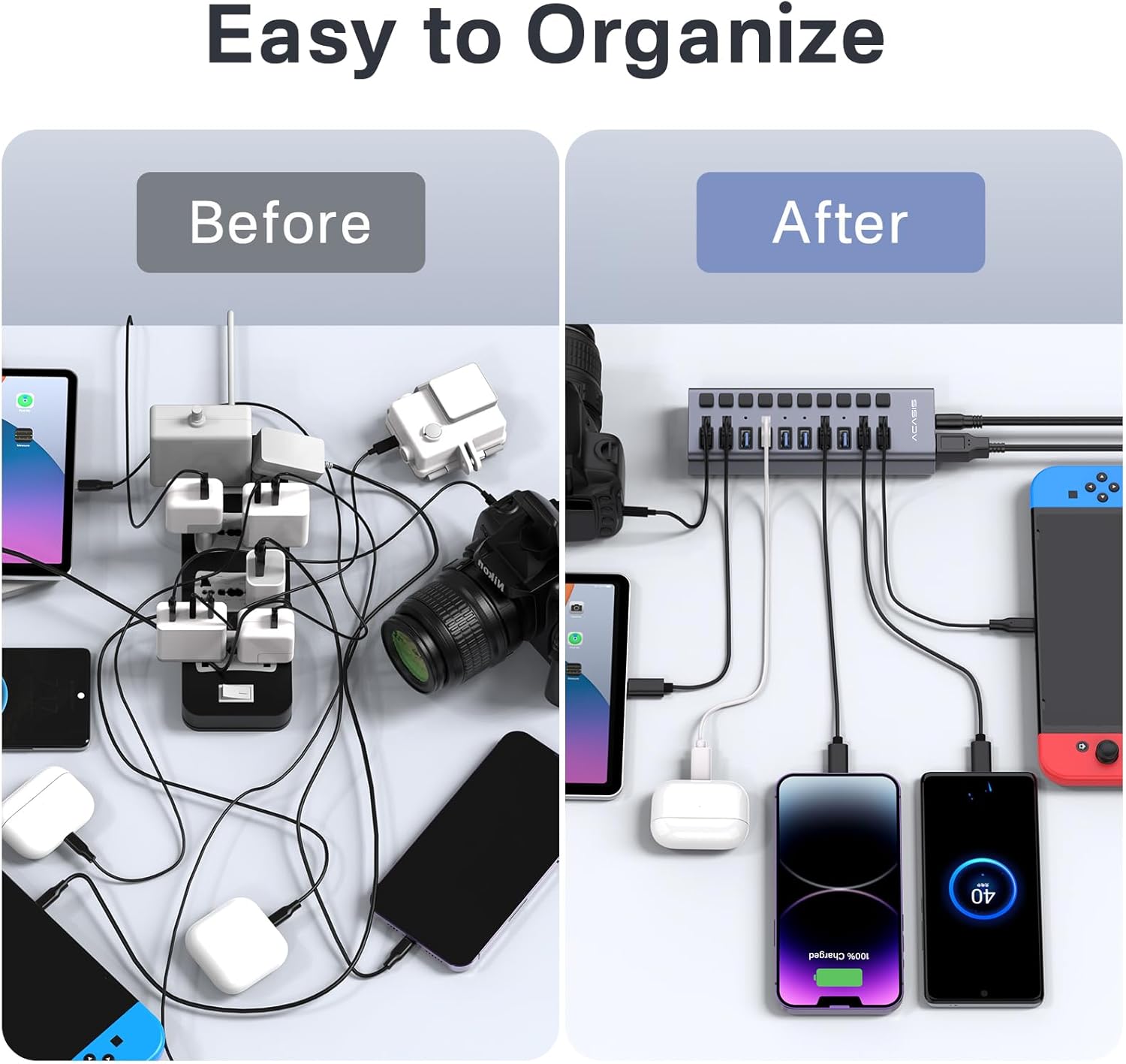 - [Independent Switch]- Each high-speed USB 3.1 port of the 10 port USB 3.1 hub has an independent switch, which is more secure, and can be directly pressed to turn on without removing the USB port cable. Each USB fast charging port of the multi USB Hub can deliver up to 1.2A of current.
