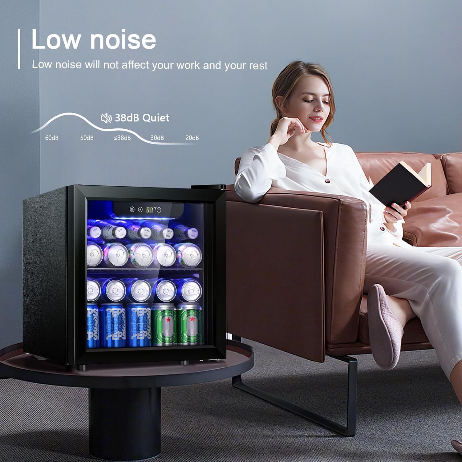 - IDEAL BEVERAGE COOLER: 16.46"D x 16.93"W x 18.5"H mini refrigerator can keep a variety of canned drinks or wine chilled without taking up too much space at your home, dorm, bar or office. It can conveniently hold 48 standard-sized drink cans or 12 standard-sized drink bottles. The interchangeable design of the left and right doors facilitates the selection of storage locations, adapts to the high-quality needs of different people and different locations.