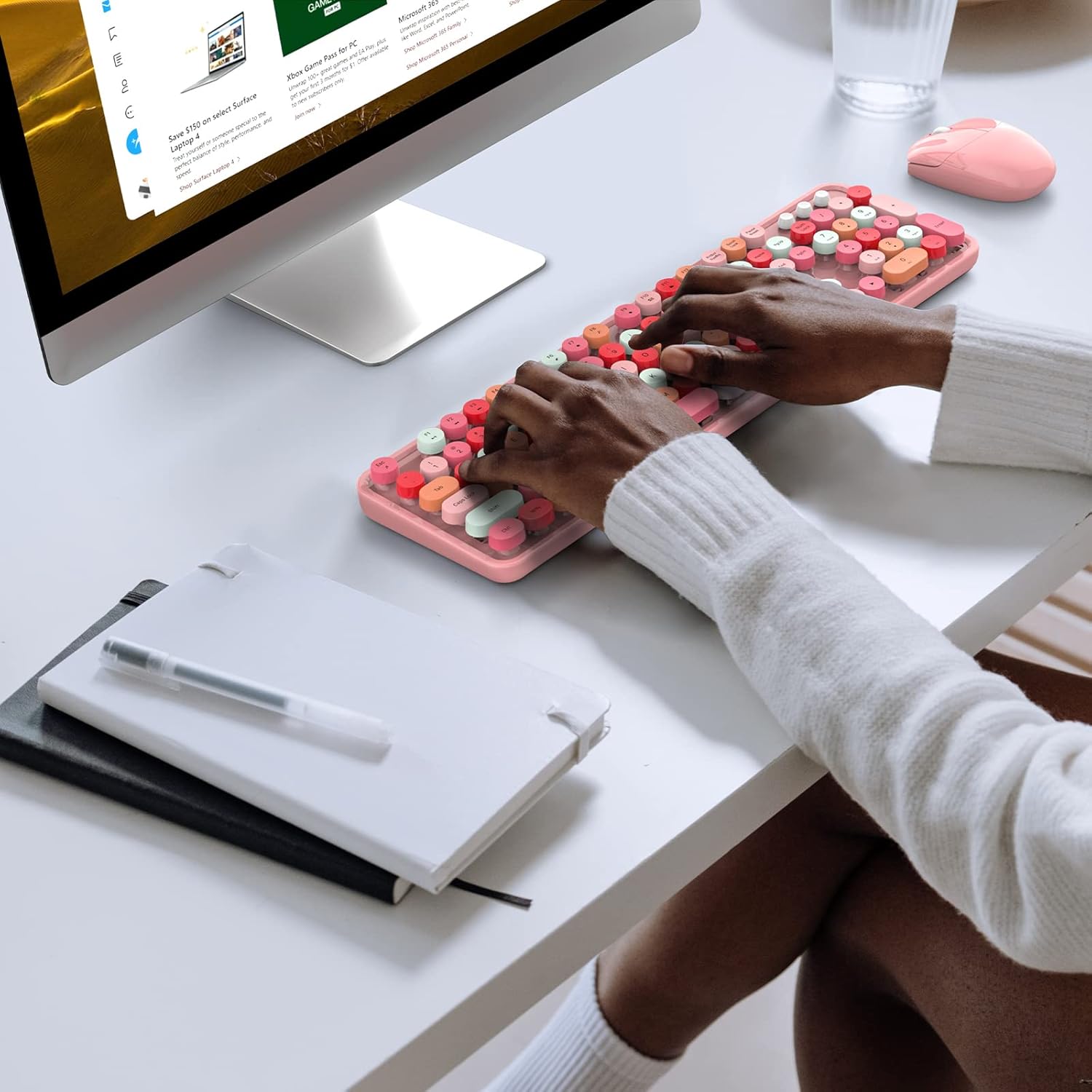 Wireless Keyboard and Mouse Combo, MOWUX Colorful Computer Full Size 2.4G Plug and Play Wireless Typewriter Keyboard and Mouse Set for Windows, Computer, Desktop, PC, Notebook (Pink Colorful)