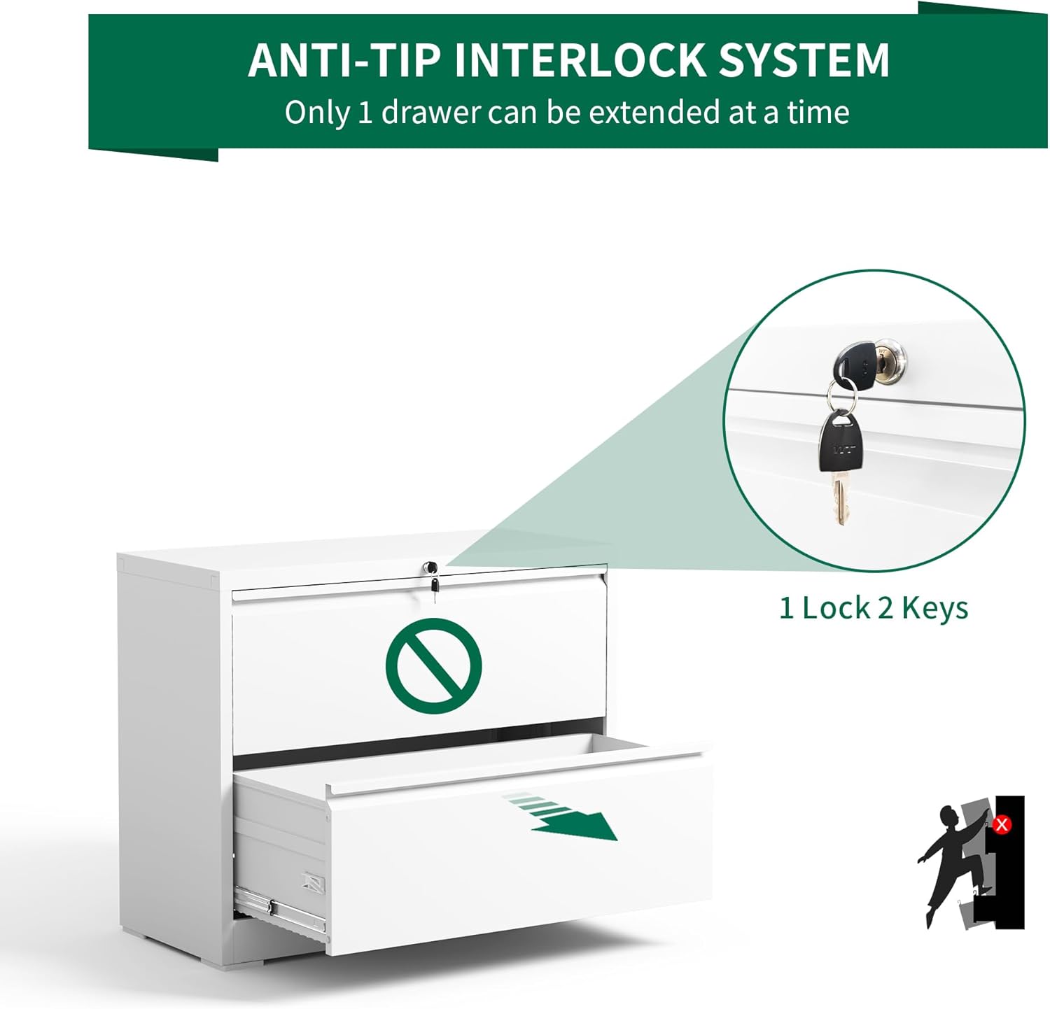 - 【Locking Cabinet for Security】This 2 drawer file cabinet with lock has an anti-tip design, which ensures that only one drawer can be opened at a time, preventing tipping and protecting your safety. The upgraded interlock system with 1 lock and 2 keys keeps your important documents safe.